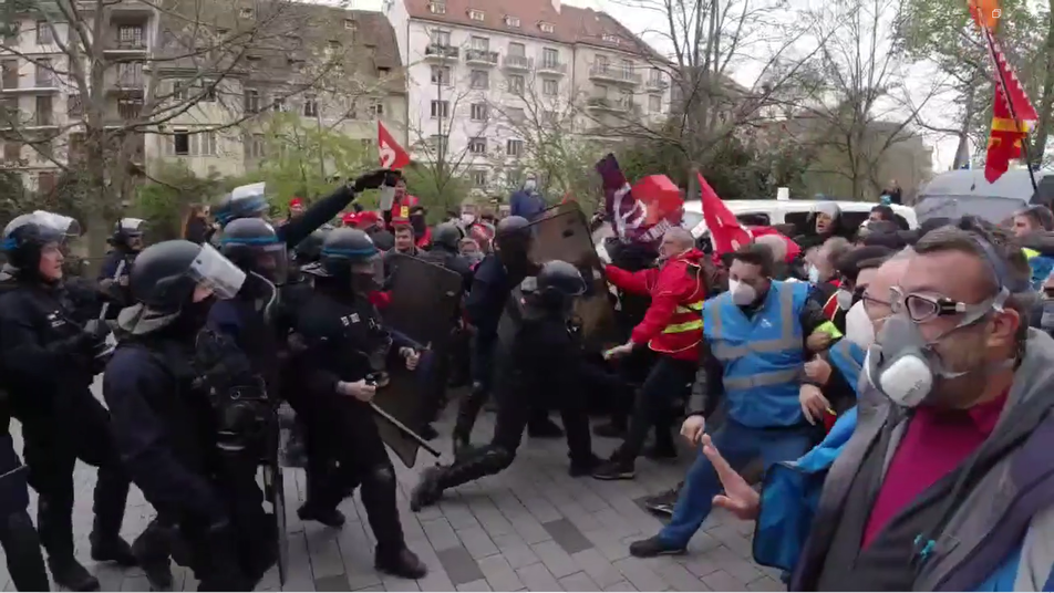 - Le service d’ordre intersyndical strasbourgeois a été gazé et matraqué pour la première fois depuis le début du mouvement social contre la réforme des retraites (voir vidéo plus bas).