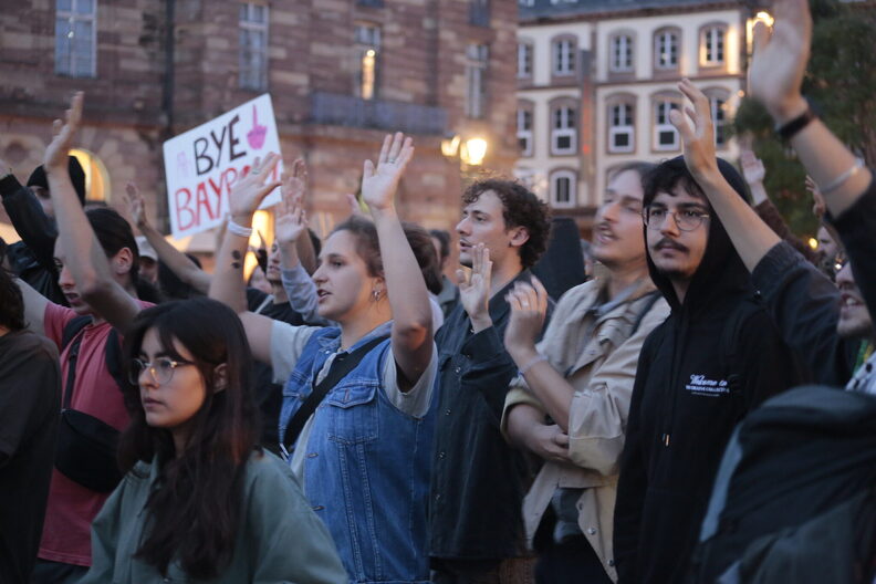 Merci François Bayrou ! Les militants et militantes du mouvement « Bloquons tout » peuvent être reconnaissants. À deux jours de leur mobilisation prévue mercredi 10 septembre, la chute annoncée du Premier ministre a offert l’occasion rêvée d’une dernière réunion festive. Plus de 300 personnes étaient réunies place Kléber à Strasbourg lundi 8 septembre à partir de 20h. Au pied de la statue du général Kléber, un vélo-cargo équipé d’enceintes diffuse une musique techno qui ravit les étudiants et étudiantes. S’ensuivent de nombreux slogans chantés dans un mégaphone. Un air de mobilisation des Gilets jaunes flotte dans l’air : « Macron nous fait la guerre et sa police aussi ! Mais on reste déter’ pour bloquer le pays ! » Mais la manifestation ce soir-là connaît une différence notable : un petit papier a circulé de mains en mains.