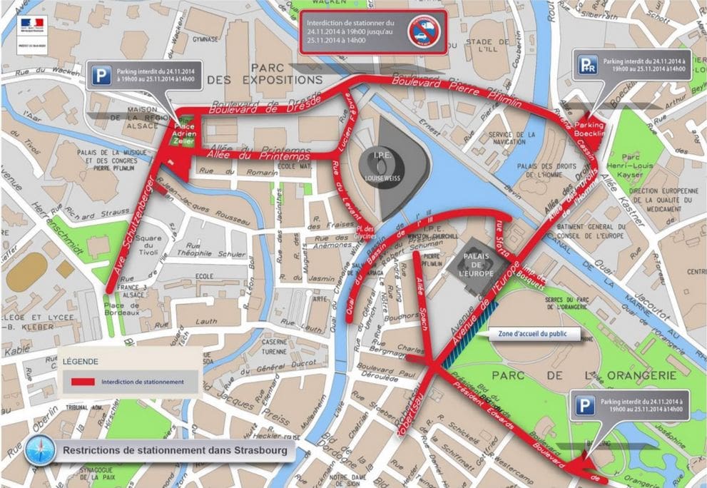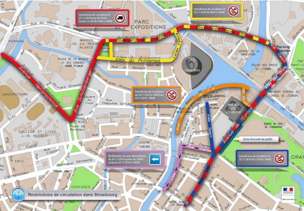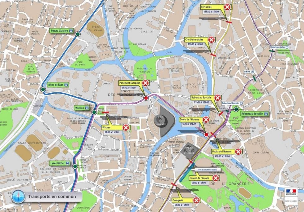 Le réseau CTS continuera de fonctionner, mais les lignes 6, 30, 72 contourneront l’Orangerie entre 11h30 et 15h. Les arrêts Fort-Louis et Cité universitaire ne seront pas desservis par le 30 entre 11h30 et 15h. La ligne 50 s’arrêtera à Rives de l’Aar et non au Wacken.