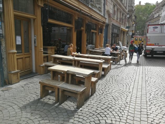 Tout au long de la promenade, Karim détaille les terrasses problématiques. Rue du maire Kuss, Grand’Rue, rue du 22-Novembre… Quant à la rue du Jeu-des-Enfants, Karim regrette l’exception faite à la charte des terrasses, qui précise que celles-ci doivent être de plain-pied. Les estrades en bois rendent l’espace difficilement praticable pour les piétons ou les personnes en fauteuils. Entre 9 et 11h, il leur faut cohabiter avec les véhicules de livraisons.