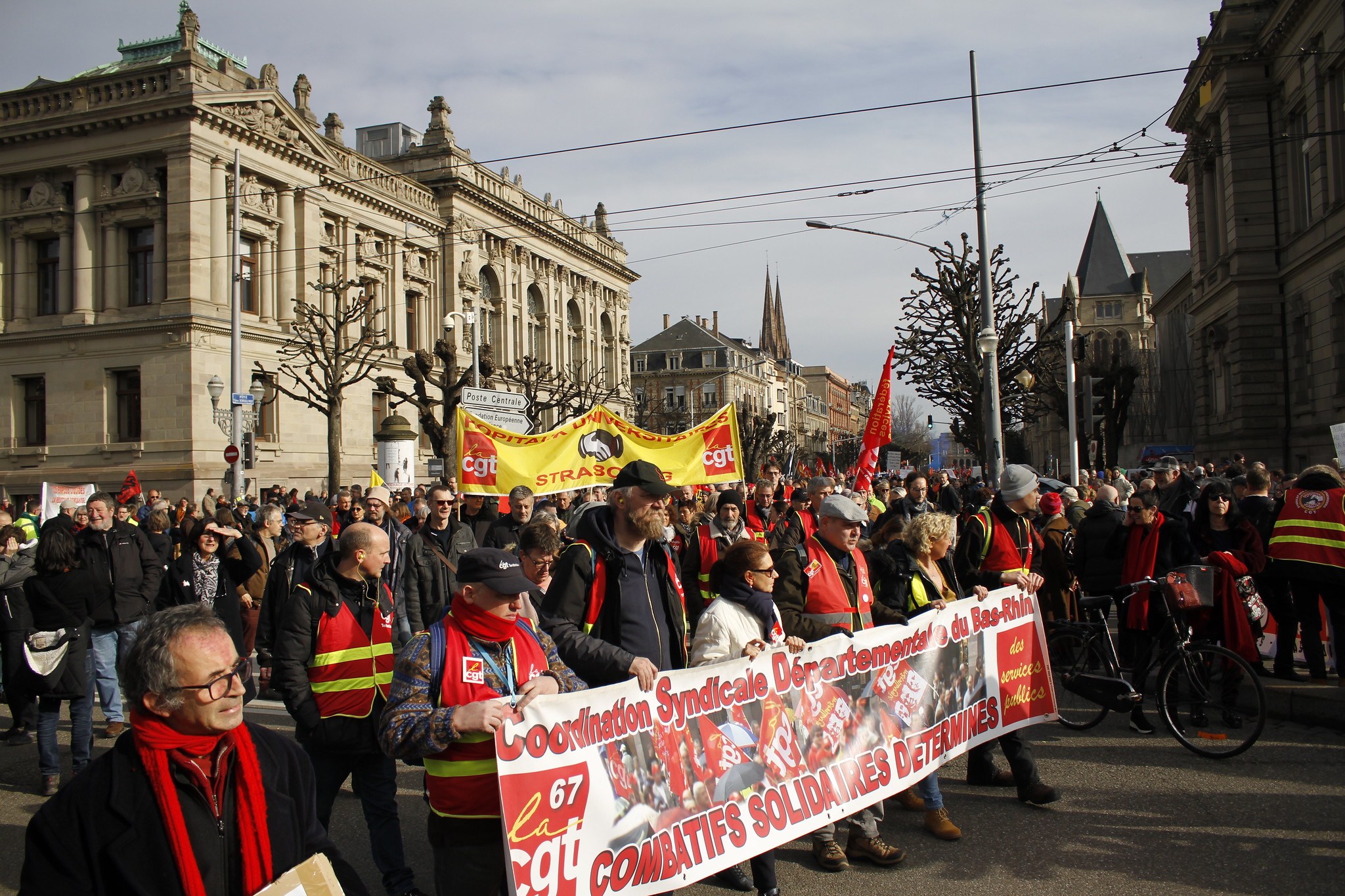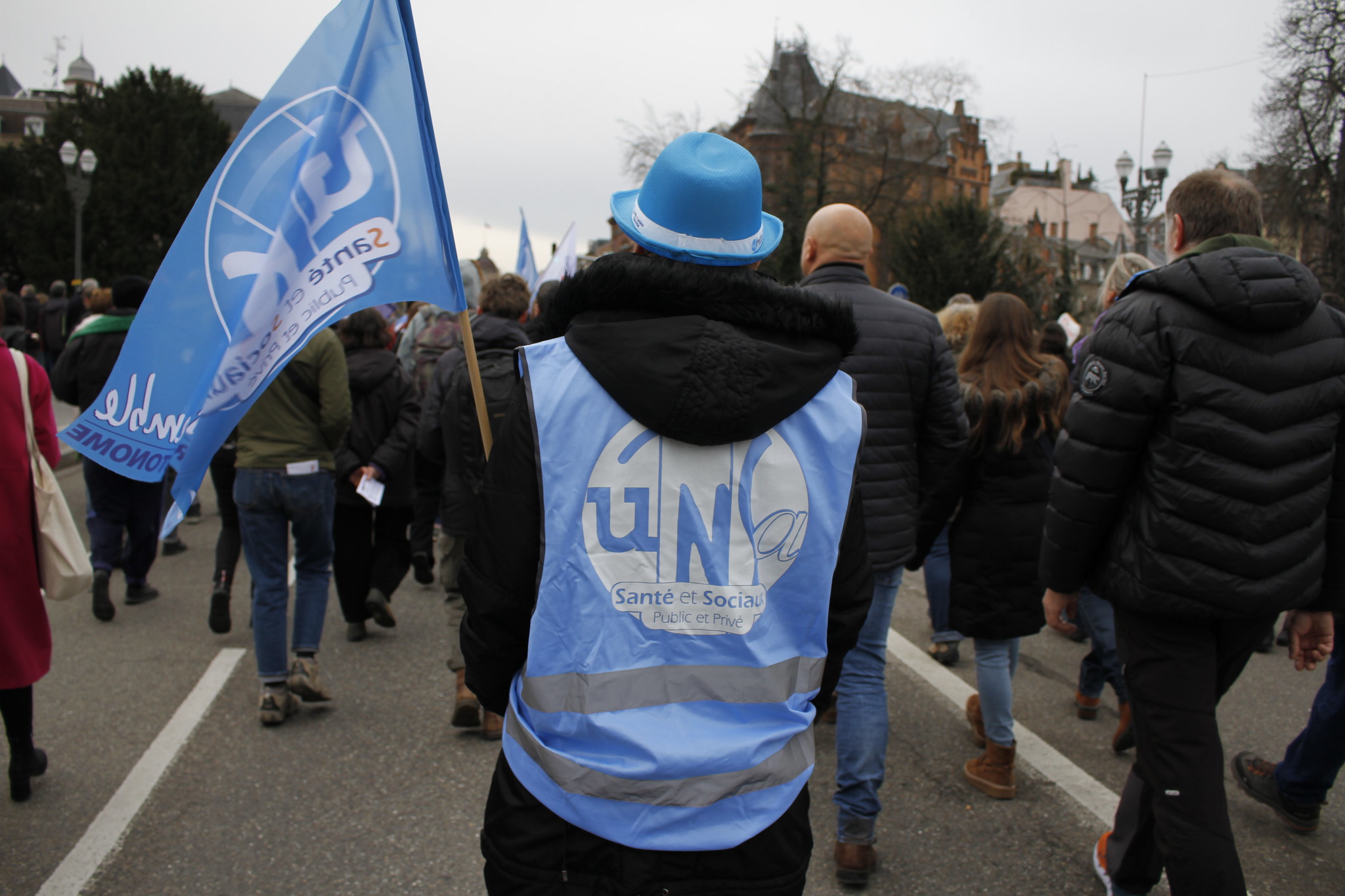 Le cortège avance doucement, sous un soleil presque printanier. Entre les chanteurs de la CGT sur leur camion, et les groupes épars de manifestants, venus parfois protester en famille – boules Quies de rigueur dans les oreilles des enfants – il y a la bande de Marie. L’infirmière en psychiatrie à l’Epsan de Brumath a tenu à changer son prénom, et ne souhaite pas apparaître en photo. « Le climat est trop compliqué là-bas », glisse la maman de deux enfants, aux traits marqués par la fatigue d’un métier difficile.