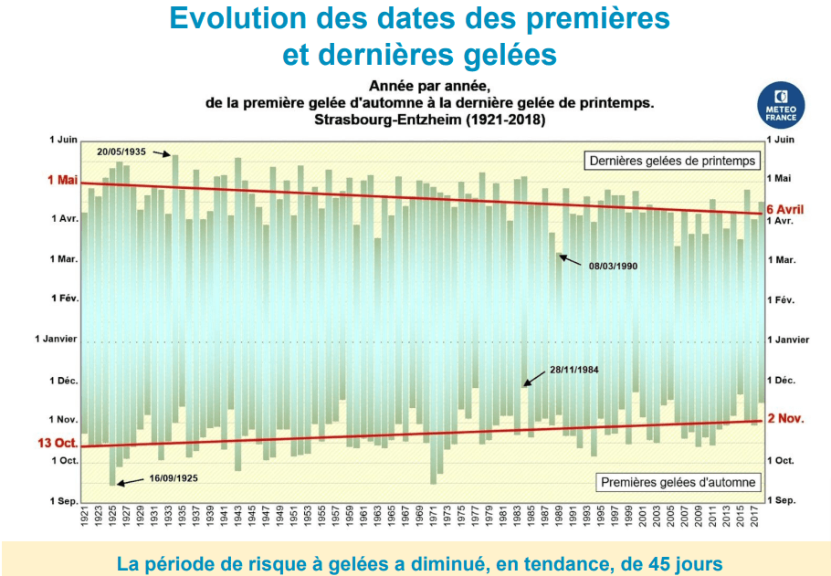 La saison froide raccourcit. Au début des années 1920, la station de Strasbourg pouvait connaître des températures négatives dès le 13 octobre et jusqu’au 1er mai. Contrairement aux températures, on ne détecte pas de changement subit, mais une tendance au resserrement de ces dates.