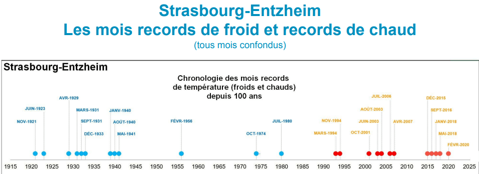 Depuis le début des années 2000, Strasbourg a connu des mois records où ses moyennes étaient comparables aux « normales saisonnières » de Marseille (août 2003 et juillet 2006), d’Alger (avril 2007), voire de Tunis (juin 2003). Par ailleurs, 5 des 12 mois les plus chauds depuis un siècle ont été mesurés entre 2015 et 2020. Les 7 autres depuis 1990. En revanche, les mois les plus froids semblent désormais appartenir aux livres d’histoire. Aucun record n’a été battu depuis juillet 1980. Les trois-quarts l’ont été entre les années 1920 et 1940.