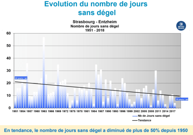 Conséquence inverse, les jours de froids diminuent drastiquement. En moyenne, on ne compte désormais que 10 jours par an sans dégel, « c’est-à-dire où le thermomètre ne repasse pas au-dessus de 0° pendant 24 heures », précise Yves Hauss, contre 22 moyenne dans les années 1950. On n’en compte même aucun en 2015 ou 2018.