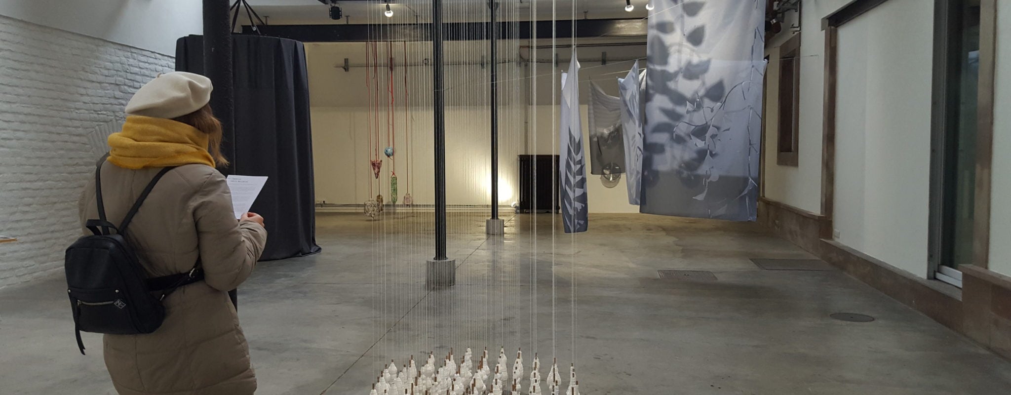 L’installation Inertie de Jamila Wallentin prend place au centre de l’espace. La pratique sculpturale de cette jeune artiste de culture franco-allemande joue de la matière et questionne le rapport aux corps. Des fils de coton blanc sont enroulés autour de fuseaux en bois de hêtre. Les fils sont suspendus au plafond et retiennent les bobines à quelques centimètres du sol. L’artiste réalise ces pièces à l’aide d’une bobineuse dont la vitesse de rotation est de 1 300 tours par minute. Ce geste d’une vitesse phénoménale semble s’arrêter momentanément. On ne distingue que la lente vibration des fils produite par le visiteur au fil de ses déplacements. Le mouvement est alors imprévisible.