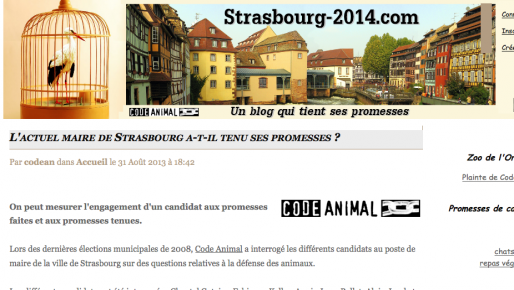 L’association Code animal, à l’origine de la plainte contre le zoo de l’Orangerie déposée il y a quelques jours, lance un blog baptisé Strasbourg-2014.com. Sur ce site, les défenseurs des animaux reprennent une à une les réponses apportées par Roland Ries au questionnaire que Code animal lui avait adressé en 2008, en amont des élections municipales, faisant le point sur les promesses tenues ou non. Au menu, interdiction du gazage des pigeons (engagement non tenu), coup de frein à l’accueil de cirques intégrant des animaux sauvages au spectacle (engagement non tenu), prise en charge des chats errants (en cours) ou repas végétariens dans les administrations et les écoles (promesse tenue)… Franck Schrafstetter, président de Code animal, explique la démarche :