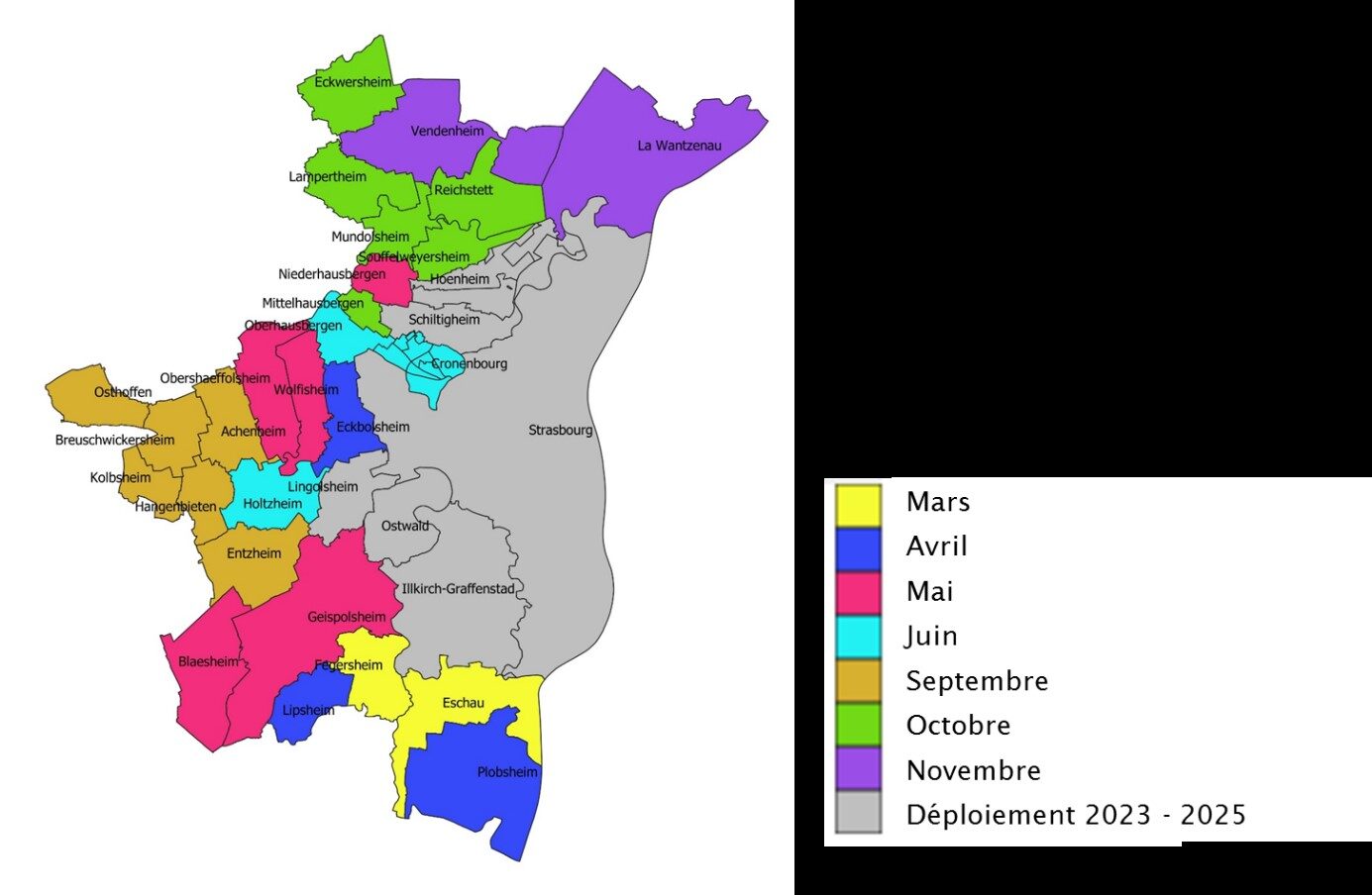 Le déploiement va débuter en 2022 dans les 26 communes de deuxième couronne. La « massification » a commencé au mois de mars 2022 à Fegersheim et Eschau. Pour les sept autres communes plus urbaines (Strasbourg, Schiltigheim, Illkrich-Graffenstaden, Bischheim, Ostwald, Lingolsheim et Hoenheim), le déploiement doit s’étaler entre 2023 et 2025.