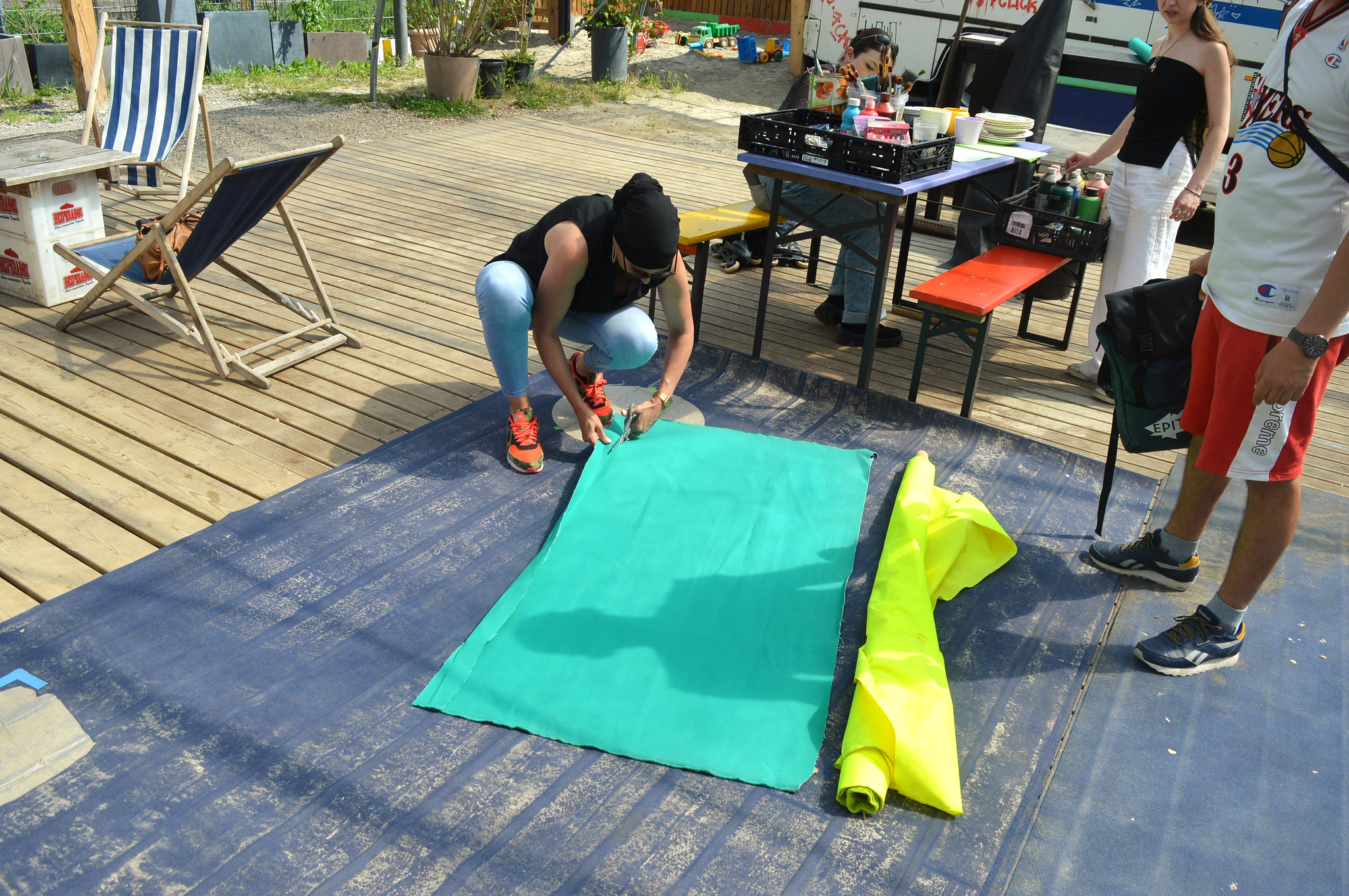 « Il y avait même des mères célibataires », raconte Magali, qui vient de la Cité de l’Ill et qui a élevé seule sa fille. Éducatrice spécialisée, elle a notamment travaillé à l’Éveil Meinau et dans la protection de l’enfance : « Comme ce sont des personnes des quartiers qui organisent, ça donne plus envie de participer. » En plein après-midi ce mercredi 26 juin, elle coupe dans un rouleau de papier vert pour fabriquer une banderole. « Le Wagon Souk sert de boîte à outil », précise Mohamed Ali Zahi. De la peinture est à disposition au milieu de la cour.
