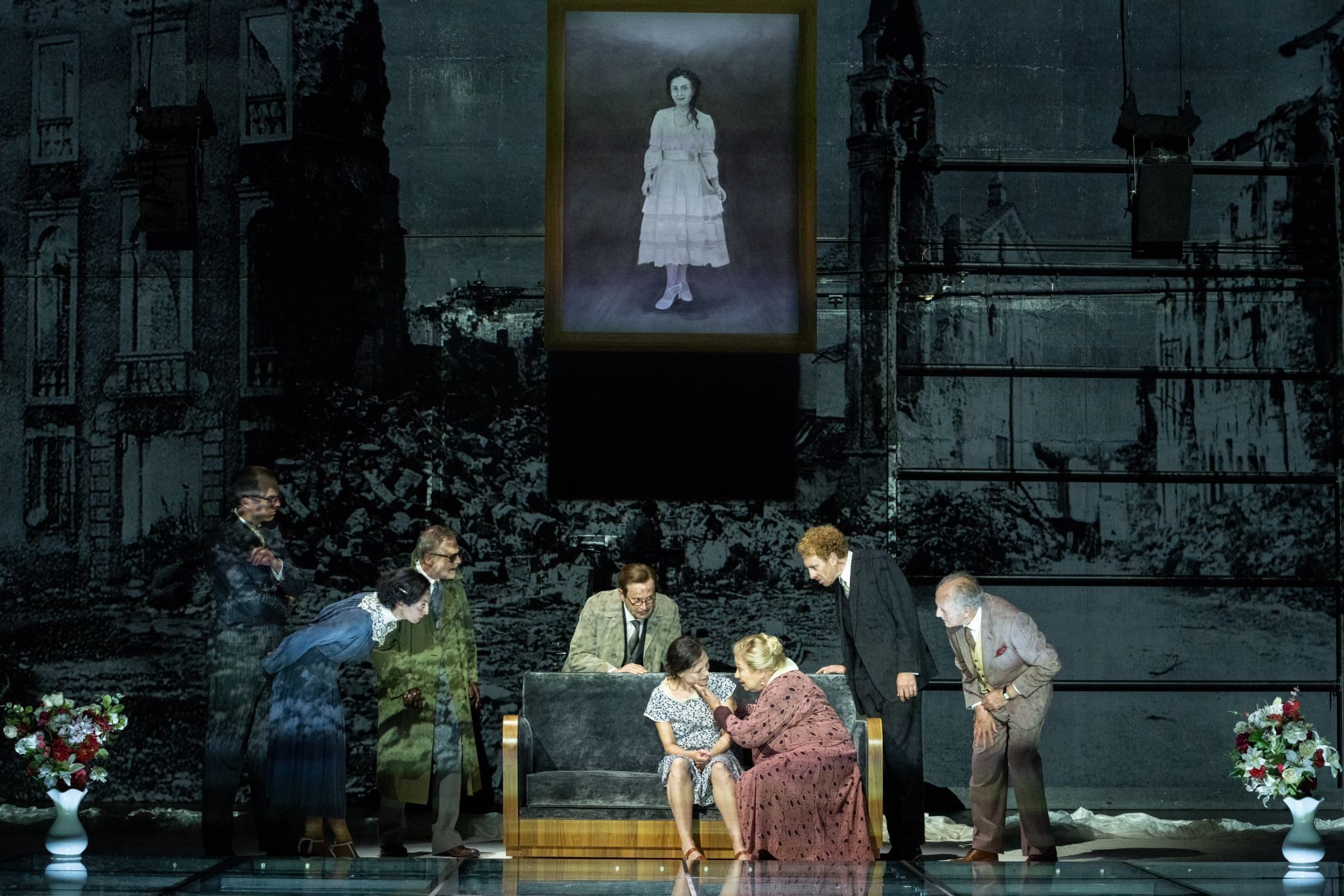 L’ambiance est oppressante pour le spectateur. Le décor se compose de quelques canapés et des vases à la disposition millimétrée, à la mode dans les années 1920. À partir du deuxième acte, un tableau est placé au centre de la scène. Il représente Lucia dans sa jeunesse et participe à créer le doute autour de l’Inconnue. La projection d’archives historiques, relatant la montée du nazisme et le triomphe du fascisme en Italie, ancre le spectateur dans ce climat angoissant.