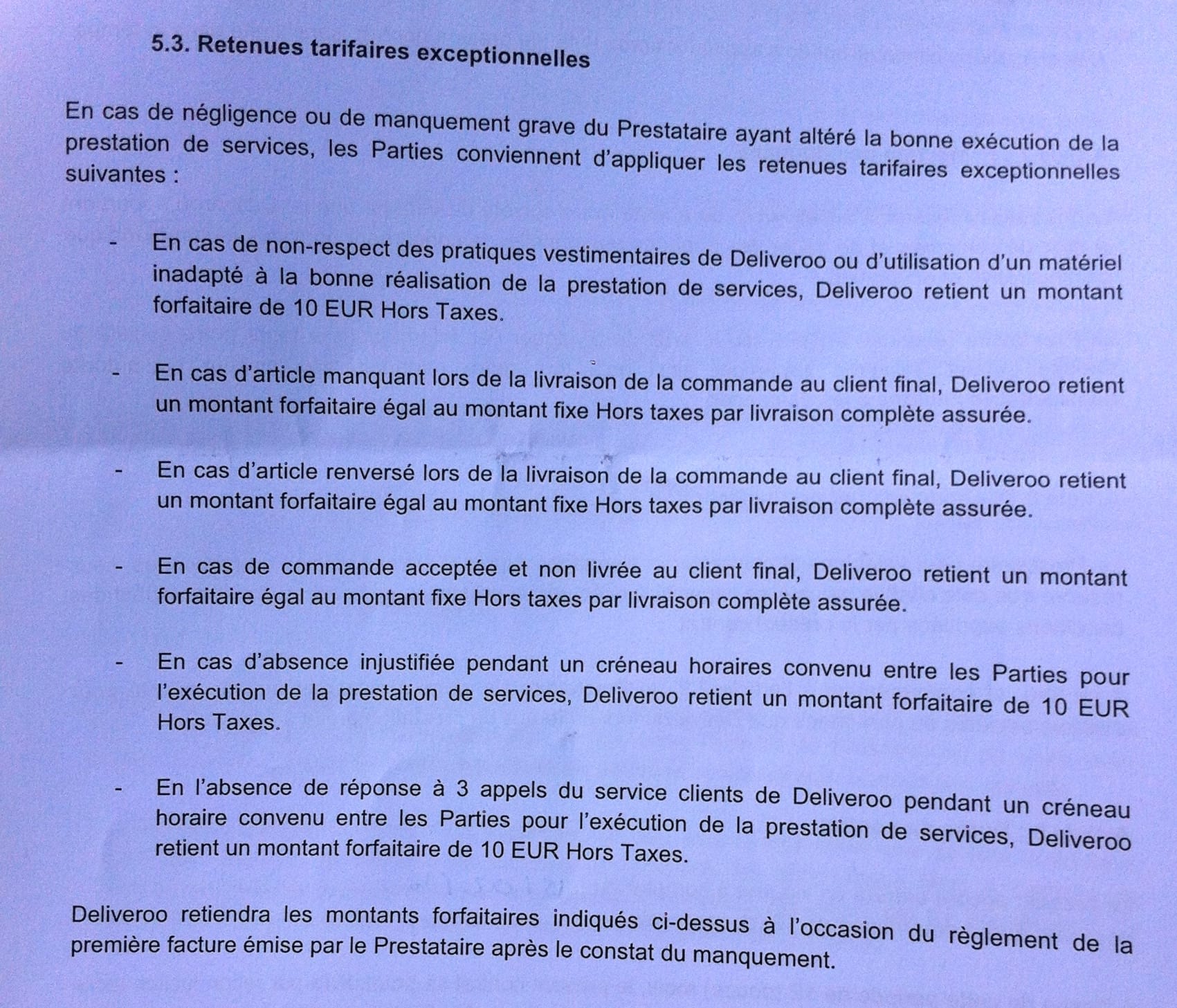 Les futurs coursiers peuvent ensuite signer un contrat type où tous les tarifs des prestations, primes et pénalités sont déjà définis. Ils n’ont aucun pouvoir de négociation, si ce n’est le pouvoir de pédaler plus et plus vite.