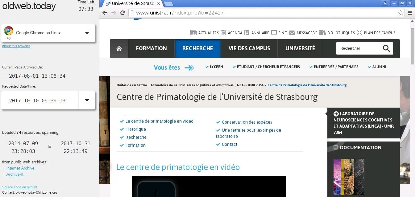 Capture d’écran du cache de la page du centre primatologie daté selon le site oldweb.today du 10 octobre 2017. Les « activités associées » n’apparaissent pas encore sur la page.[/caption]