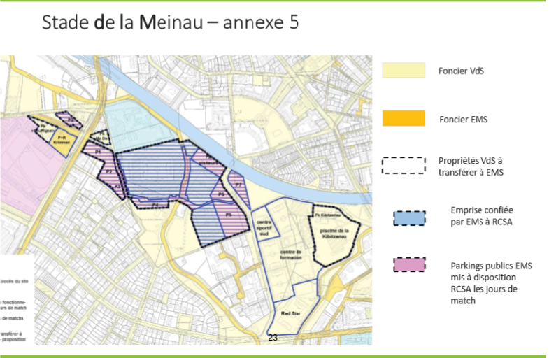 Enfin, concernant le stade de la Meinau, la Ville de Strasbourg transfère le stade, mais aussi les parkings publics et gratuits attenants. Néanmoins, tout projet sur ces terrains nécessitera l’accord de la municipalité strasbourgeoise. Le Racing Club de Strasbourg étudie un agrandissement, qui vise surtout à ajouter des loges. Des montants très variables ont été annoncés, de 60 à 120 millions d’euros.