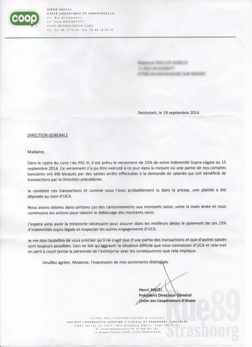 Les difficultés de trésorerie ont conduit Henri Ancel à différer le versement des indemnités de départ d’une partie des salariés, ceux pour lesquels les transactions ont été validées, comme le montre la lettre ci-dessous, reçue par une ancienne employée ;
