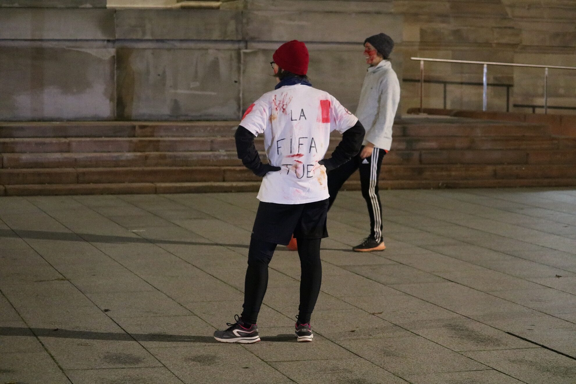 Ce mardi soir, le groupe a décidé de jouer sur le parvis du palais de justice pendant le premier match de l’équipe de France au Qatar, pour fustiger « l’inaction de nos dirigeants et l’hypocrisie de la Fédération française de football » et parce que « le sport, c’est politique« . Barbouillée de faux sang, ayant tracé des slogans (« Coupe du monde de la honte », « la FIFA tue ») sur les t-shirts et sur un drapeau français taché, la petite dizaine de personnes présentes veut montrer un autre visage du ballon rond :