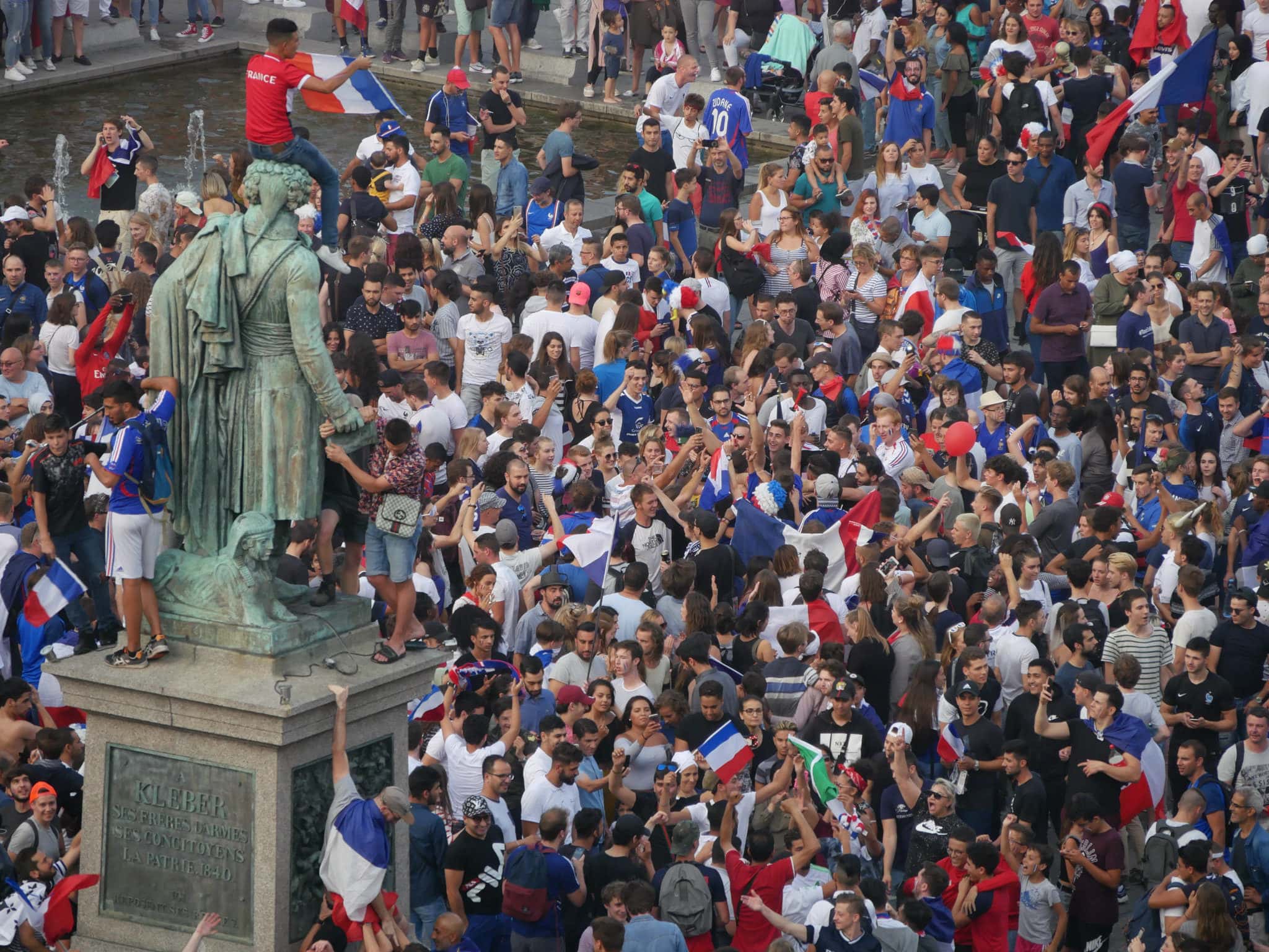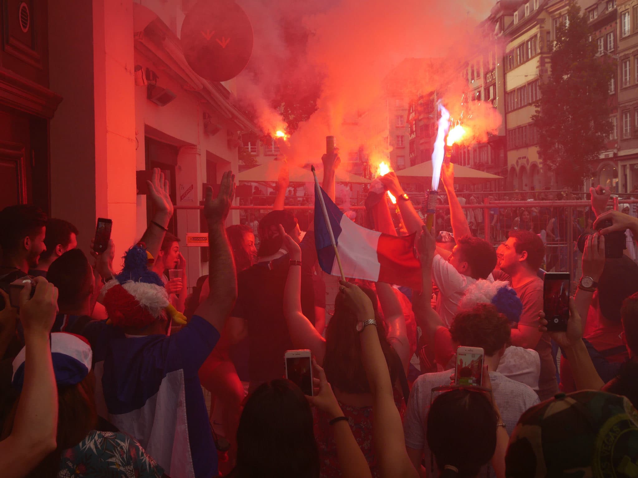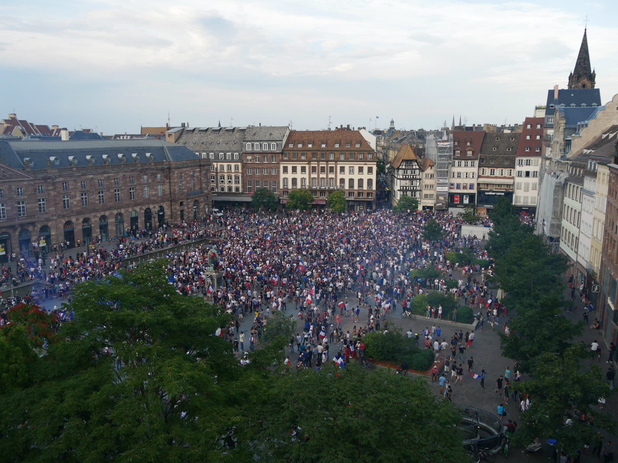 La France remporte la Coupe du monde 2018 ! En cette fin d’après-midi du dimanche 15 juillet, les Strasbourgeois ont laissé éclater leur joie après le coup de sifflet final. Danse sur des rythmes de djembés, fumigènes bleu-blanc-rouge, klaxons…