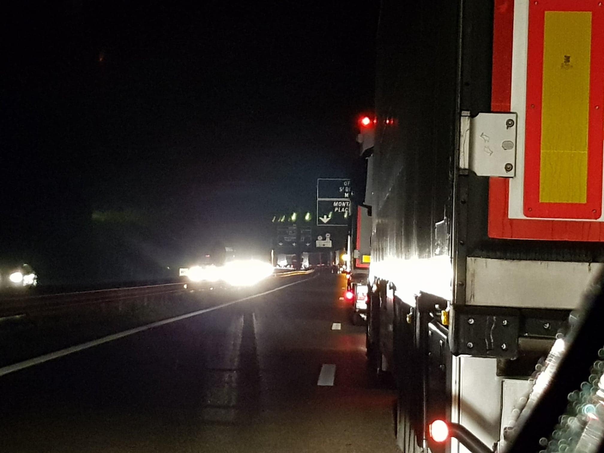 23h50 – Camions et voitures sont presque à l’arrêt sur l’autoroute A35 en direction de Colmar, au niveau de la sortie Porte Blanche.