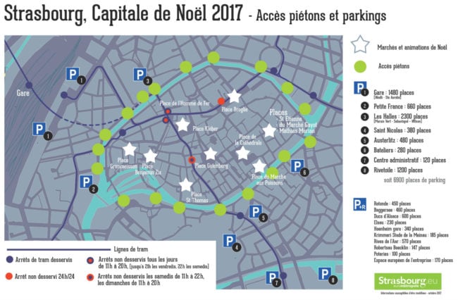 Comme en 2016, les tramways ne desserviront jamais la station Broglie. Celle de l’Homme-de-fer sera fermée aux heures d’ouverture du Marché de Noël, tout comme celle Langstross Grand’Rue, mais uniquement lors des cinq week-ends. La circulation des bus dans le périmètre sécurisé est maintenue.