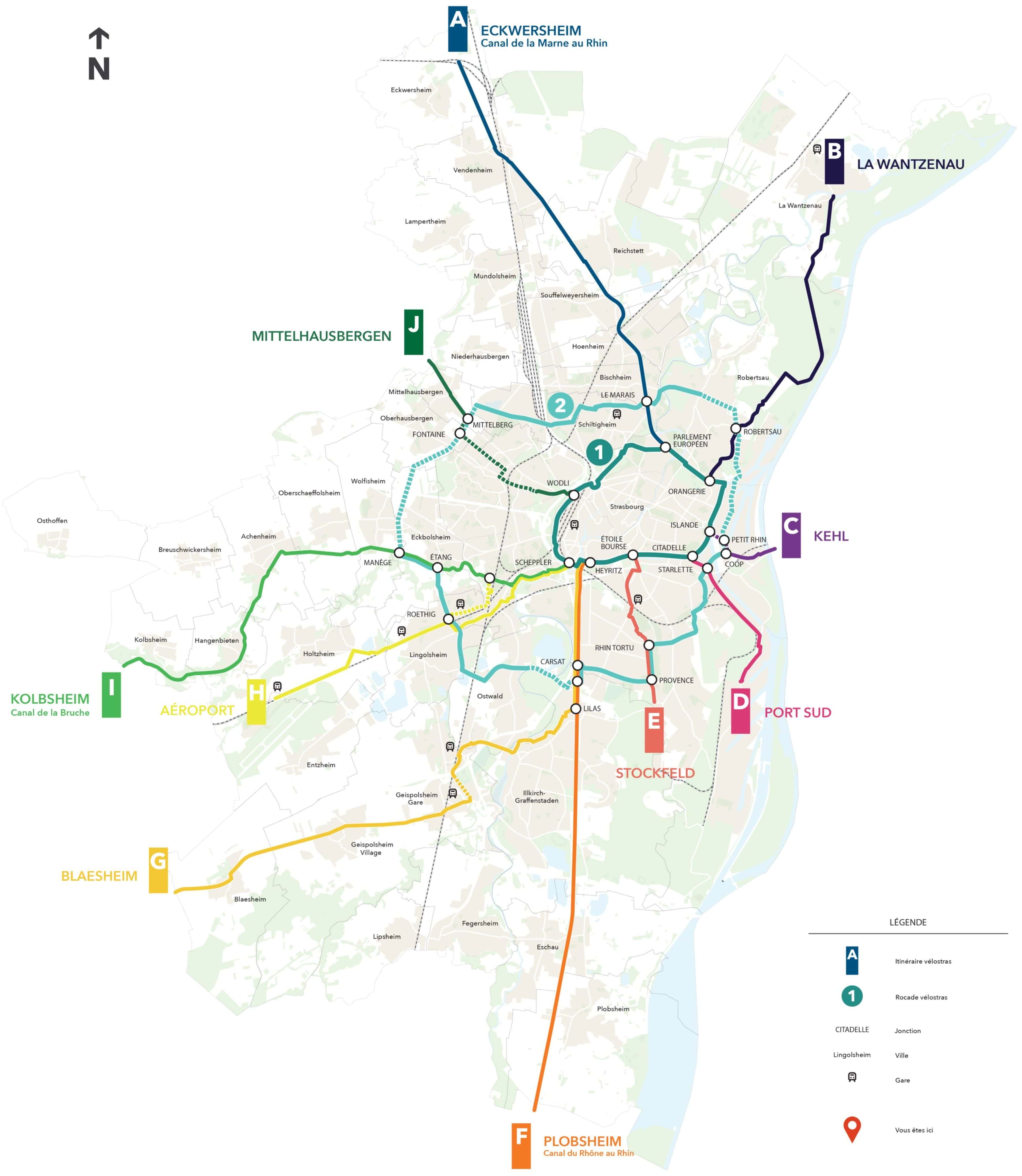 Présenté fin 2018, le réseau « Vélostras » revisité, désormais promis pour… 2030, ne prévoit plus de contournement au plus près du centre-ville. La piste la plus centrale, la numéro 1 ne prévoit plus qu’un TRÈS grand contournement du centre, derrière la Gare, par la place de Haguenau, le Parlement européen, l’Orangerie, le parc de la Citadelle, les quais le long du nouvel hôpital civil ou encore le pont Pasteur.