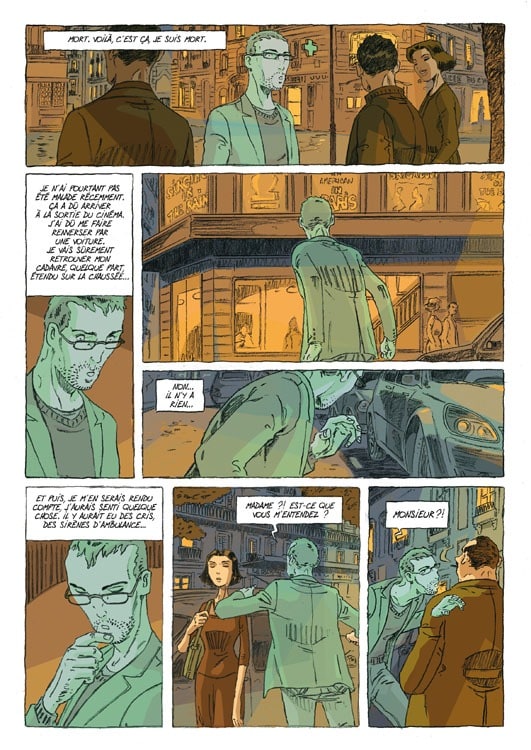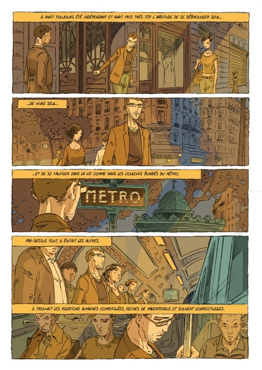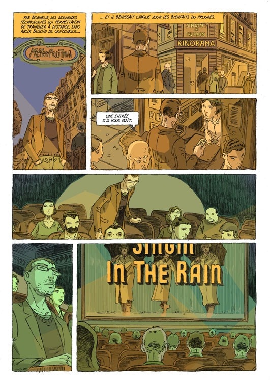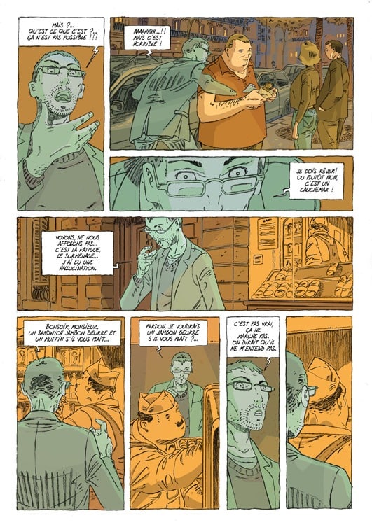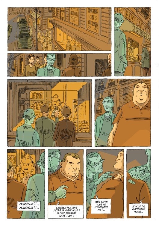 « La vie. Pour L’homme qui n’existait pas, mon postulat de départ est que le personnage perd tout matérialité du jour au lendemain. Une sensation que tout le monde peut expérimenter, ce sentiment de vacuité de la vie, qu’on peut ressentir quand on se fait doubler dans une file d’attente par exemple… J’apprécie aussi le travail très solitaire – comme mon personnage ; il m’arrive de passer des journées sans voir personne, si ce n’est ma compagne et mes enfants le matin et le soir. Et comme le héros, je suis cinéphile… Oui, c’est mon album le plus autobiographique. J’ai même pensé un moment situer l’action à Strasbourg. Mais non, ça faisait trop de points communs. »
