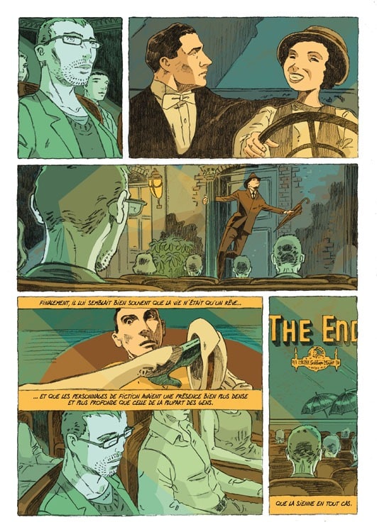 « En tant qu’auteur, je suis dans le questionnement – une position un peu différente quand je travaille avec un scénariste (Roger Seiter sur la série Fog par exemple). Dans Chambre obscure, il s’agit en apparence d’une intrigue policière à rebondissements, traité sur un mode assez ludique, mais, sur le fond, j’aborde le rapport entre la réalité et la fiction, à travers deux personnages féminins : la tante, qui croit à l’expérience de la vie, et sa nièce, plongée en permanence dans ses lectures et qui vit un peu par procuration. Dans La belle image, une adaptation d’un livre de Marcel Aymé que j’aurais aimé écrire, la réflexion se situe dans le rapport aux autres, l’image qu’on a de soi-même et que les autres nous renvoie. Et dans le dernier album, L’homme qui n’existait pas (toujours chez Futuropolis : voir planches ci-dessous), j’en reviens à la thématique du rapport fiction/réalité, à travers un personnage de cinéphile solitaire, qui fuit la réalité de la vie et se réfugie dans la fiction des films hollywodiens. Au niveau graphique, je suis dans un registre semi-réaliste, avec lequel j’aime bien jouer. De temps en temps, je vais plus vers le réalisme (L’homme qui n’existait pas), à d’autres moments, plus vers la caricature (Chambre obscure).