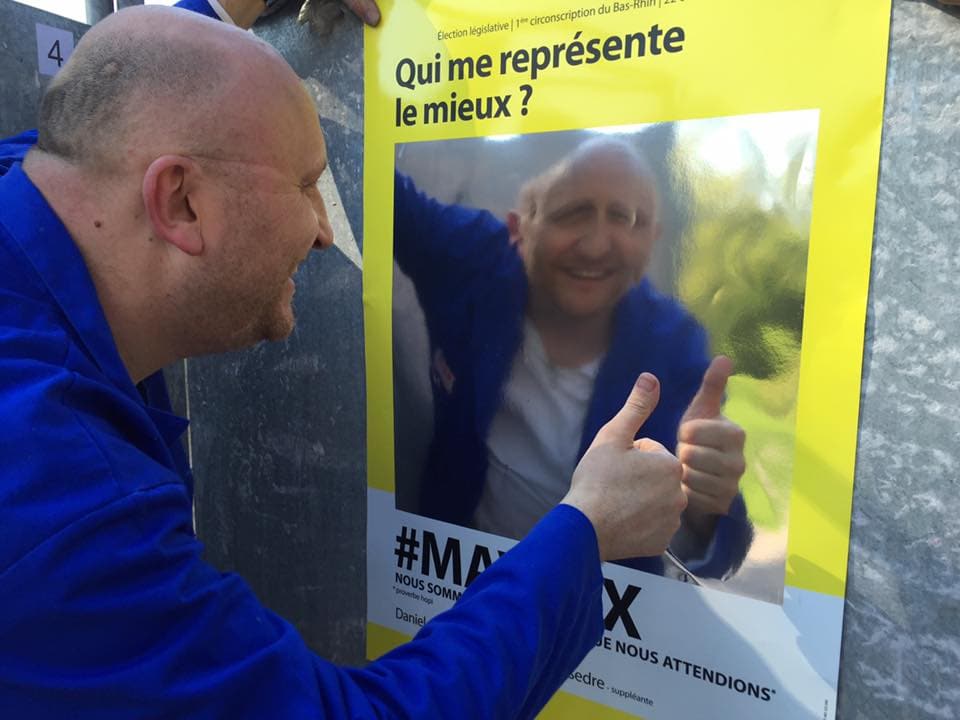 Plus qu’une réunion, « ce qui marche le mieux ce sont les rencontres au bord des panneaux », explique Marc Philibert, très impliqué localement comme « une quinzaine » de Strasbourgeois. L’affiche est un miroir sur papier avec la question « qui vous représente le mieux ? » pour que le passant se voit dessus. Ironie du tirage au sort, l’affiche jaune figure entre celle du candidat PS et celui de « Les Républicains » (Jean-Emmanuel Robert), en septième position (sur 14 candidats). « Dans le centre-ville, il y avait juste Guillaume D’Andlau (sans étiquette) et Éric Elkouby. À Hautepierre on était les seuls », poursuit Marc Philibert au sujet du premier jour de collage, lundi 2 mai. Le dernier tiers des affiches sera collé mercredi 4 mai.