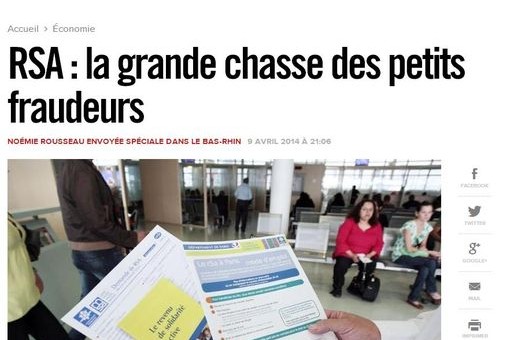 Dans une enquête publiée dans Libération, on apprend que chaque maire bas-rhinois est démarché par un conseiller territorial du Conseil général du Bas-Rhin. L’objectif ? Lister tous les bénéficiaires du RSA de la commune, vérifier leur train de vie pour débusquer d’éventuels fraudeurs. Ce contrôle échoit normalement à la Caisse d’allocation familiales, qui verse les indemnités aux bénéficiaires et qui estime à 2% le pourcentage de malversations. Mais Guy-Dominique Kennel, président (UMP) du Conseil général du Bas-Rhin, qui finance le RSA, pense qu’il y en a plus que ça, compte tenu de l’augmentation de cette charge sur son budget (de 92M€ en 2012 à 130M€ en 2013).