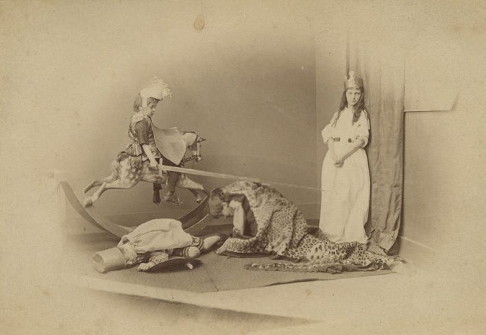Nous découvrons également des mises en scènes plus théâtrales avec plusieurs personnages en costume, comme ce magnifique chevalier en cote de maille. C’est très simple et très beau. L’extrême netteté des clichés de Carroll (réalisés au collodion humide) fait disparaître les 150 ans qui nous séparent de ses modèles et nous aide à plonger immédiatement dans son monde imaginaire.