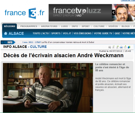 L’Alsace a perdu un de ses plus grands ambassadeurs du bilinguisme : André Weckmann s’est éteint dimanche à l’âge de 87 ans. Agrégé d’allemand, enseignant au lycée de Neudorf de 1961 à 1989, l’écrivain, originaire de Steinbourg, dans la vallée de la Zorn, était vu par beaucoup comme un des plus grands auteur alsacien. Il est encore temps de se faire son avis en plongeant – en alsacien, français ou allemand – dans un des trente ouvrages dont il est l’auteur. Notamment « Les nuits de Fastov », qui raconte l’expérience des Malgré-Nous dans cette ville de Russie où il a été prisonnier pendant la Deuxième Guerre-Mondiale.