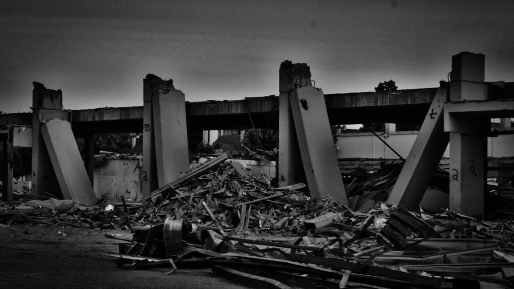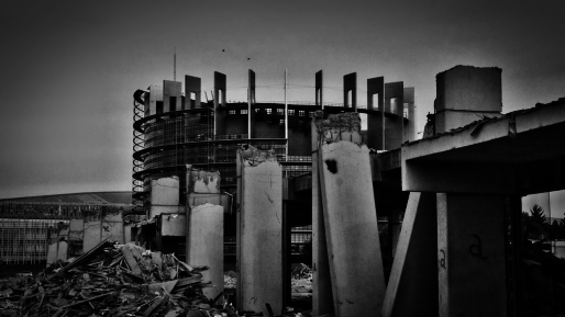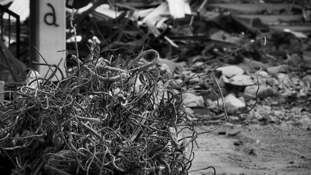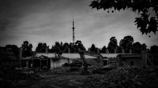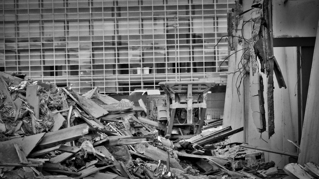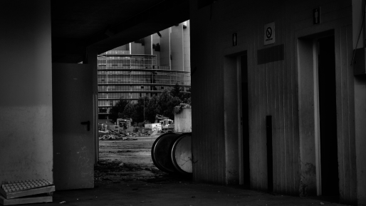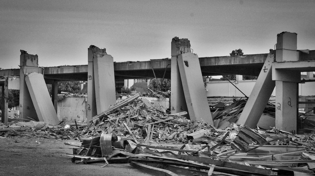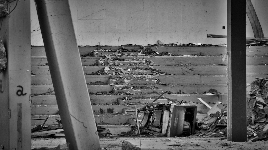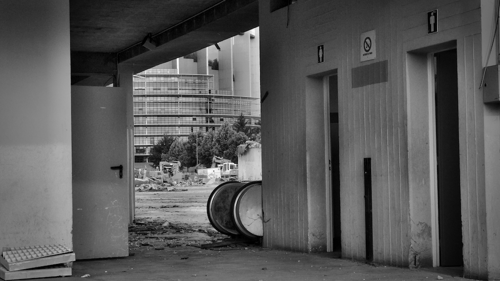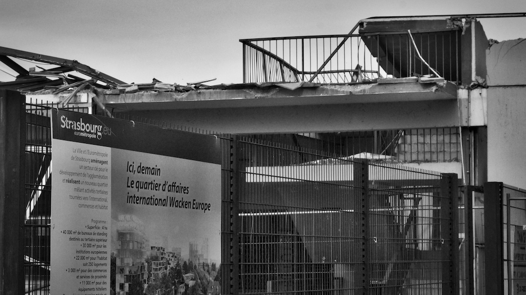 Construit en 1969 par l’architecte Mario Cardosi et mis en service en octobre de la même année, le « Hall 5 du Wacken » était là bien avant le Parlement Européen qui lui fait face. Il est aujourd’hui en phase terminale de démolition, un processus qui dure déjà depuis le mois de mars et qui vise à laisser la place au nouveau quartier d’affaires. Les pelleteuses sont en train d’arriver à bout du bâtiment et les gradins sont à ciel ouvert.