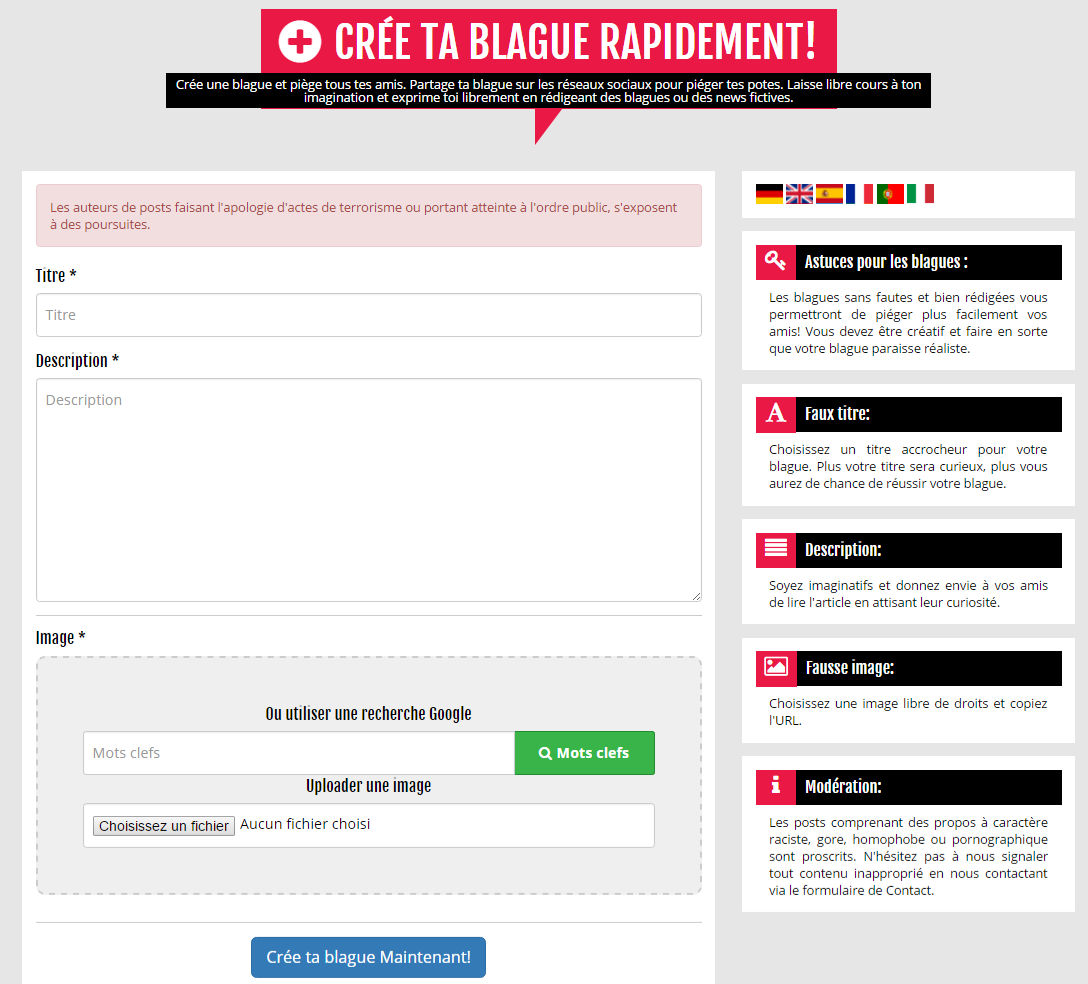 Nous aussi, la vue de ce titre nous a fait bondir la première fois. Avant de se rendre compte qu’il s’agissait d’un contenu d’un site parodique : actualitésdujour. Ce site permet de fabriquer en quelques clics ses propres intox, contrairement au site plus connu Legorafi (ou celui d’infos locales Tomimag), dont les contenus sont rédigés par les gestionnaires.