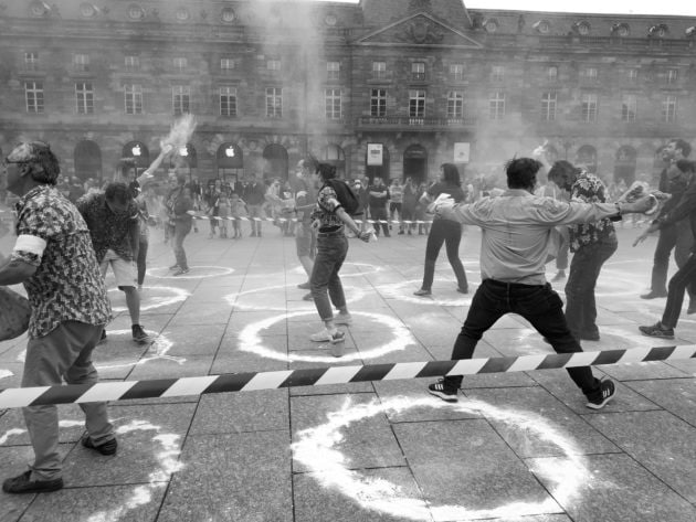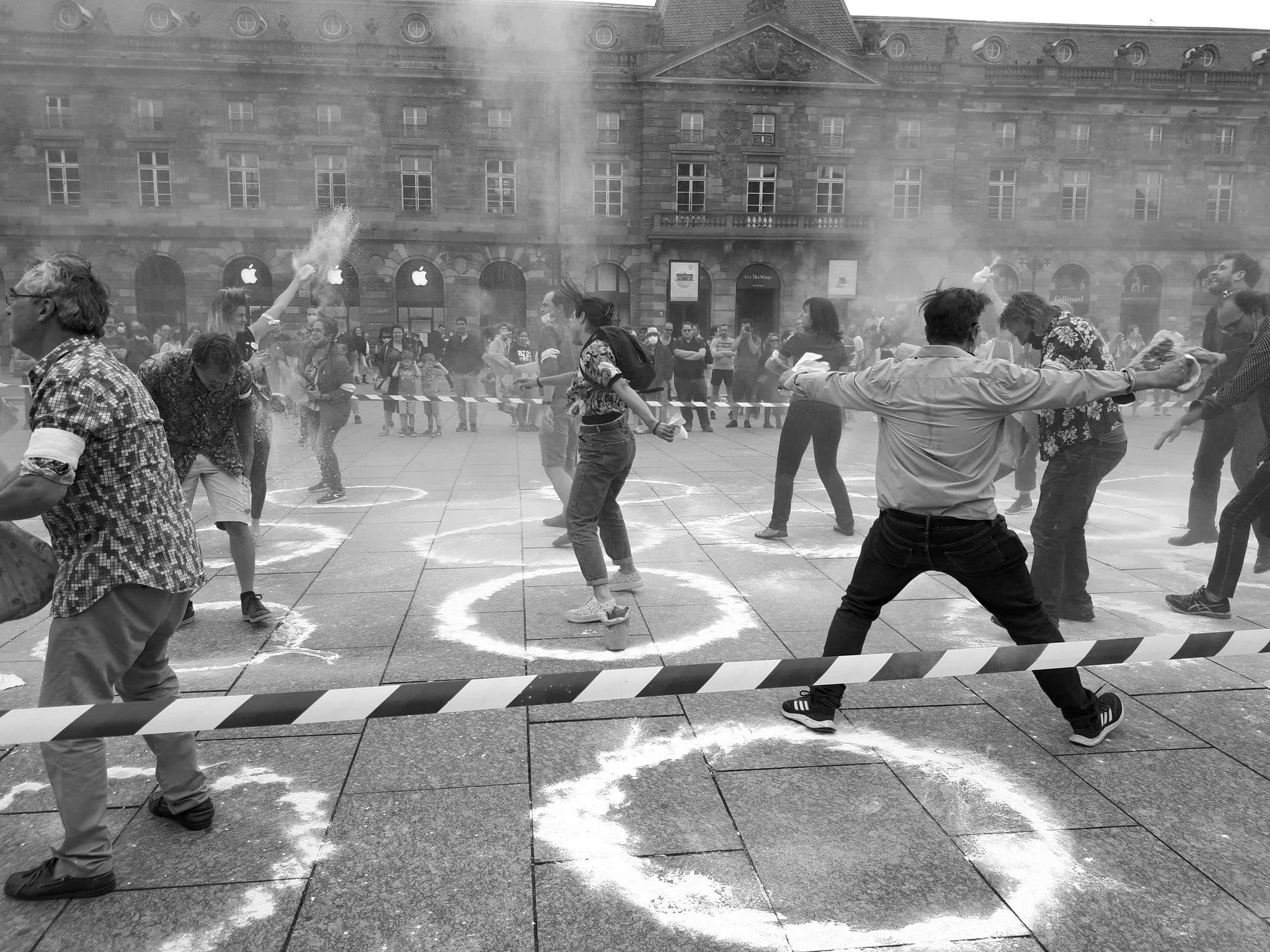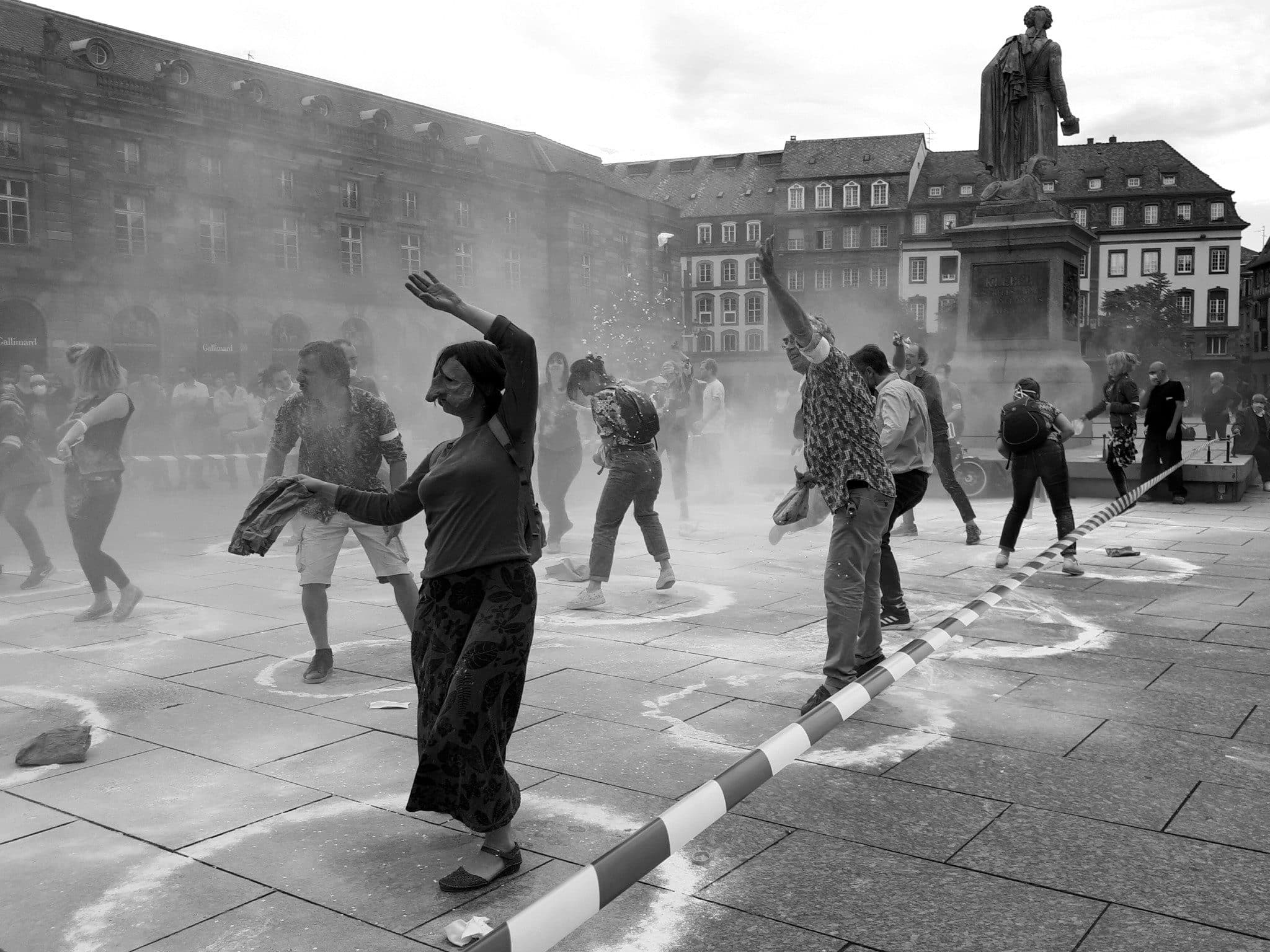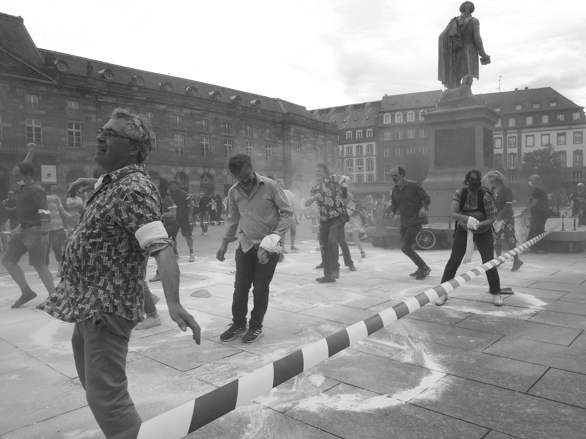 Samedi 20 juin en début d’après-midi, une trentaine d’artistes du spectacle vivant, comédiens et techniciens de Strasbourg et alentours étaient place Kléber à Strasbourg pour proposer un mini-spectacle politique aux passants.