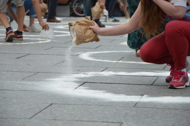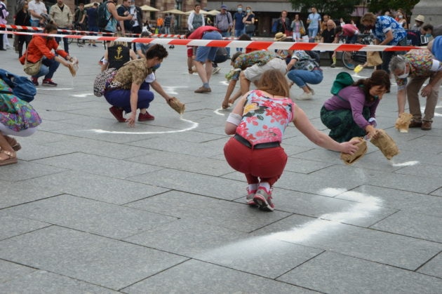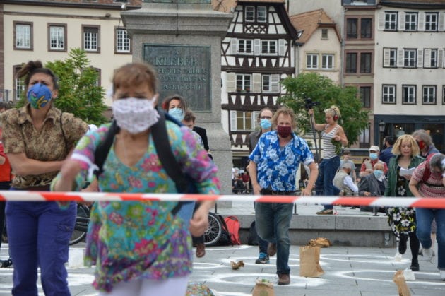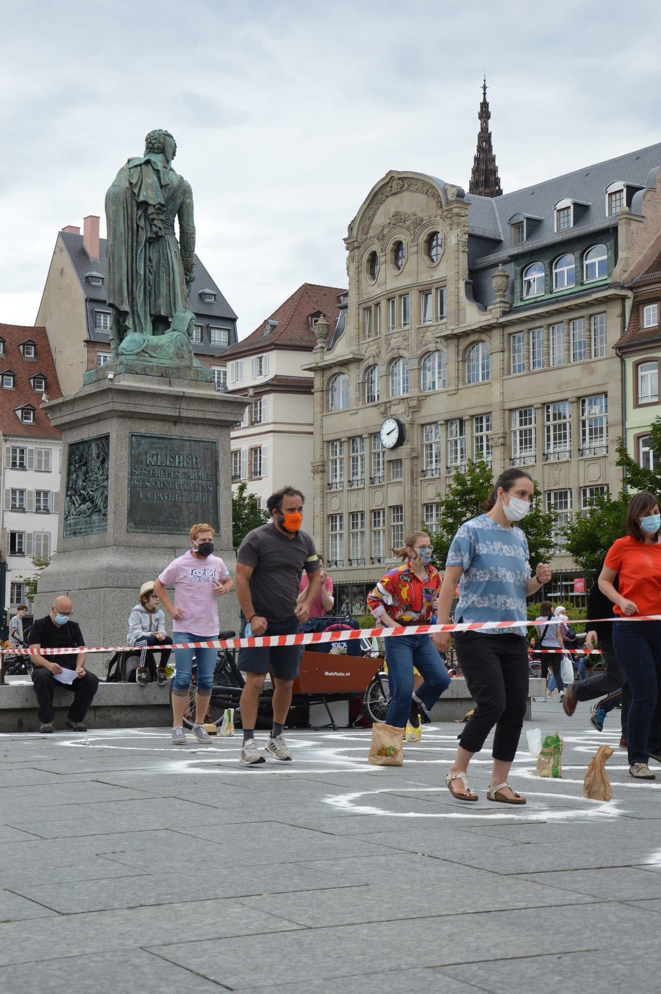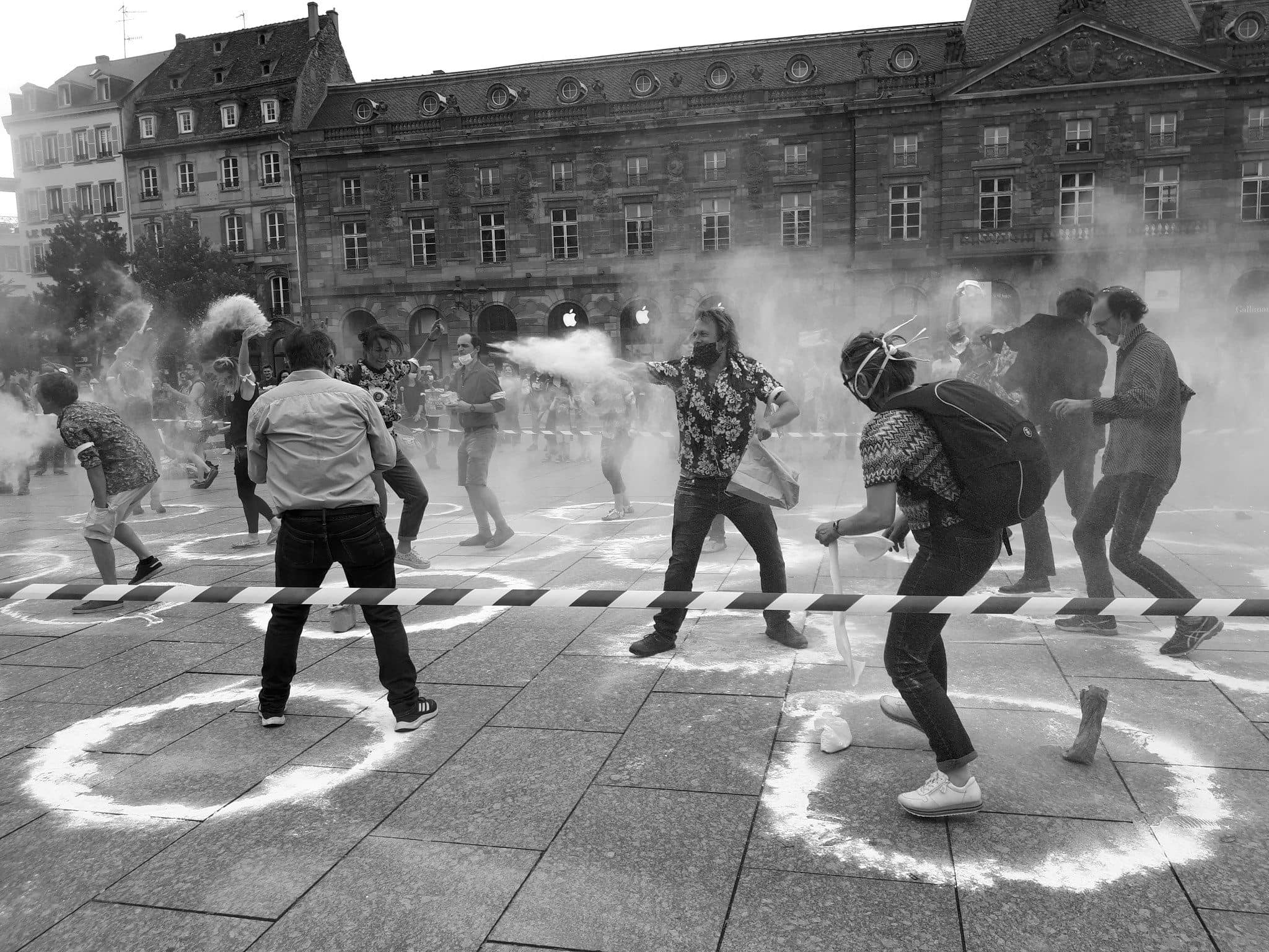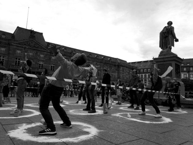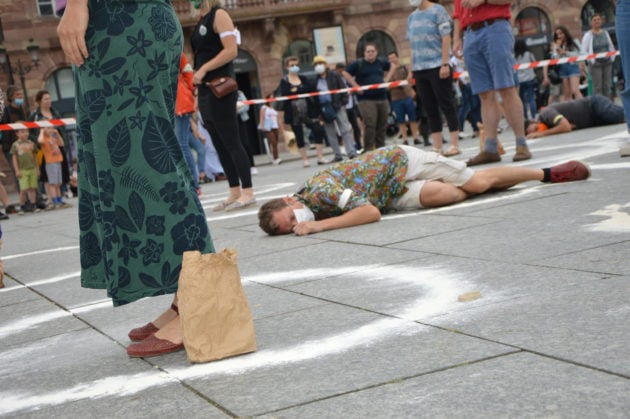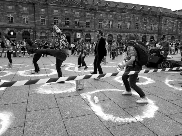 Samedi 20 juin en début d’après-midi, une trentaine d’artistes du spectacle vivant, comédiens et techniciens de Strasbourg et alentours étaient place Kléber à Strasbourg pour proposer un mini-spectacle politique aux passants.