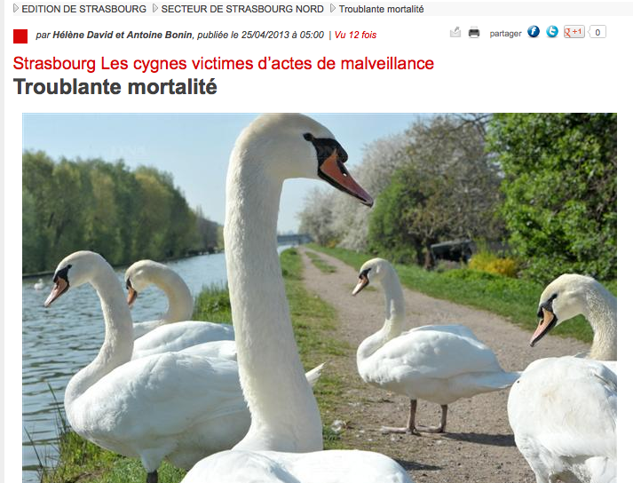 Dans un article publié ce matin dans les DNA, l’on apprend que des cygnes sont victimes de « malveillance » dans le nord de l’agglomération strasbourgeoise. Le maire de Hœnheim, Vincent Debes, raconte qu’il a surpris des adolescents en train « d’aligner » des cygnes au pistolet à air comprimé, un matin en faisant son jogging le long du canal de la Marne-au-Rhin. L’édile a déposé plainte au nom de la commune pour tenter de mettre fin à ces « actes de cruauté ». Des cygnes ont aussi été retrouvés la tête tranchée ou empoisonnés. Il s’agit d’une espèce protégée. Les auteurs de ces actes encourent de 750 à 1500€ d’amende.