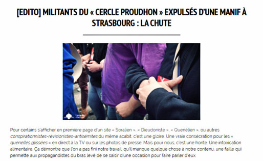 Les deux jeunes hommes, qui se revendiquaient du cercle Proudhon, n’ont pas réagi lorsqu’ils étaient traités de nazis. Ils ont en tout cas réussi à diviser les manifestants sur la légitimité de leur présence dans le groupe. Le tout sous le regard des policiers, qui se sont gardés d’intervenir, les échanges n’étant pas violent. Les deux jeunes hommes ont finalement manifesté sur le côté de la route.