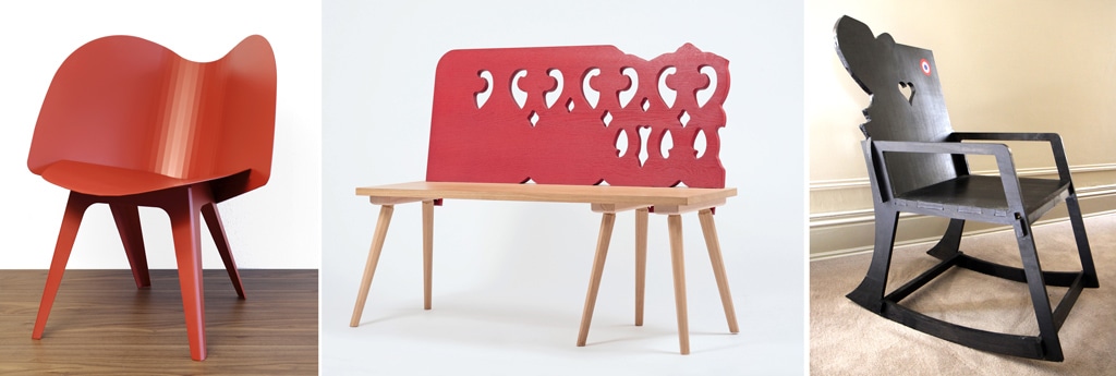 L’objet qui a suscité le plus de réinterprétations est la chaise. Les pieds divergents et légèrement en fuseau (oui, comme dans les années 50) sont caractéristiques du mobilier alsacien et, dans la majorité des cas, subsistent dans la version 2014. Le fameux dossier sculpté, si pittoresque mais tellement inconfortable, est lui transformé.