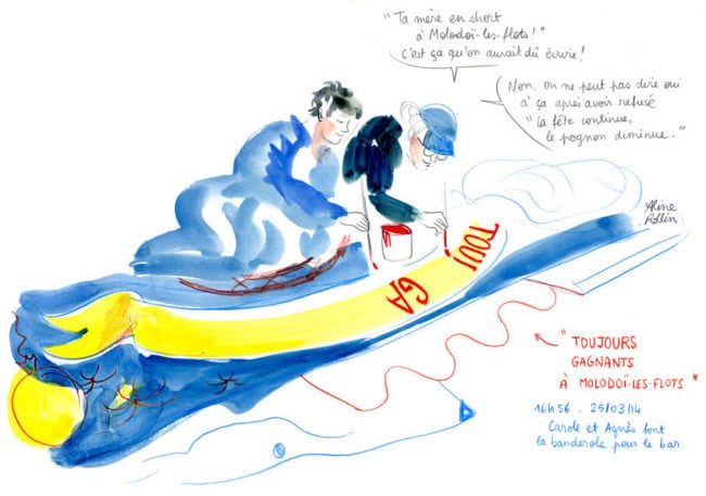 Carole et Agnès font la banderole pour le bar / Live sketching (Illustration Aline Rollin)