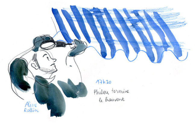 Philou termine l’auvent / Live sketching (Illustration Aline Rollin)