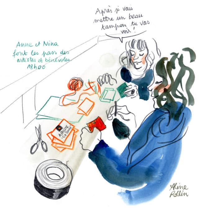 Anne et Nina font les pass des artistes et des bénévoles / Live sketching (Illustration Aline Rollin)