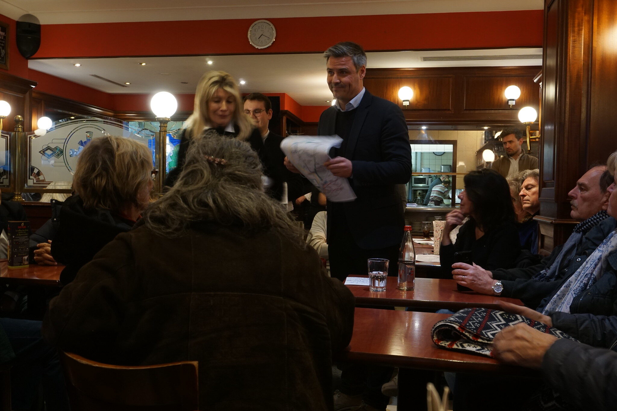 Les têtes grises présentes dodelinent pour approuver. Venu écouter l’opposition, le conseiller mobilités de la Ville, Pierre Helwig, désapprouve à l’écart. Quelques instants plus tard, il est rejoint par l’adjoint chargé de la mobilité, Pierre Ozenne, qui débarque en plein milieu de la réunion. Silence dans l’assistance. Après un bref moment d’étonnement, l’orateur de droite reprend son discours. Jurant qu’il n’est pas « anti-tram », il dézingue le coût du projet d’extension qui s’élève à 140 millions d’euros pour un résultat qu’il estime inepte et mal préparé.