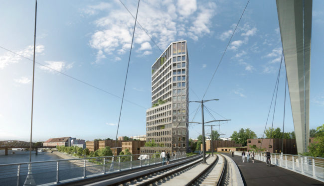 Le jury de la société publique locale (SPL) des Deux-Rives a décidé de l’allure d’un premier bâtiment sur la presqu’île Citadelle, en face du parc éponyme, au beau milieu de l’axe conduisant Strasbourg vers le Rhin. Rue89 Strasbourg vous en parlait en mars : il s’agira d’une tour triangulaire au pied de la passerelle André Bord, où circule le tram D. Le promoteur strasbourgeois SAS-3B a été retenu, associé aux cabinets d’architectes KCAP Architects & Planners et Oslo Architectes.