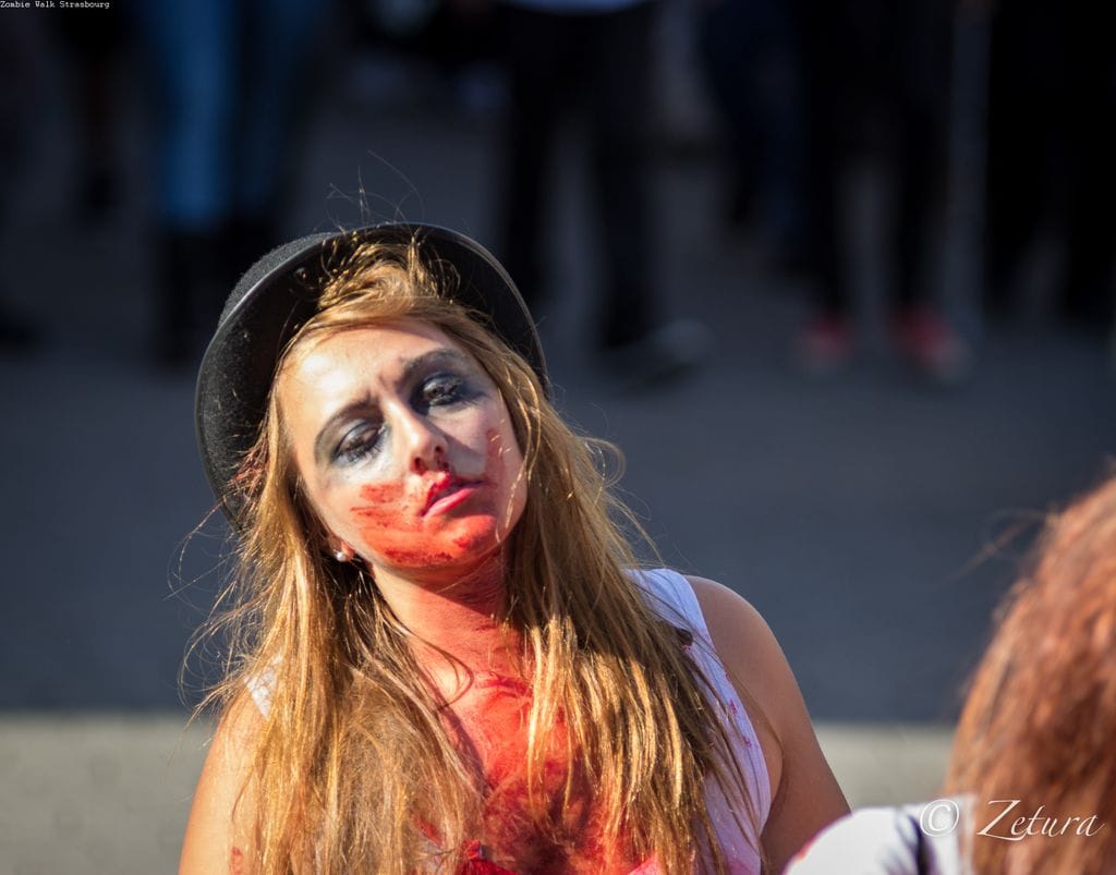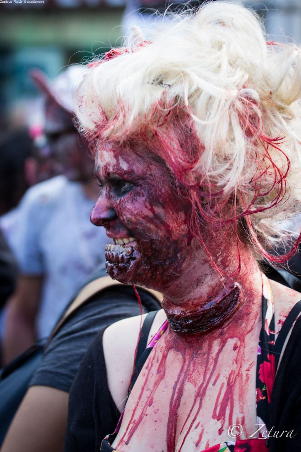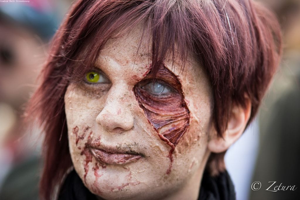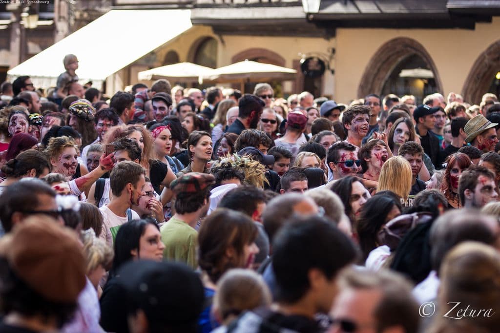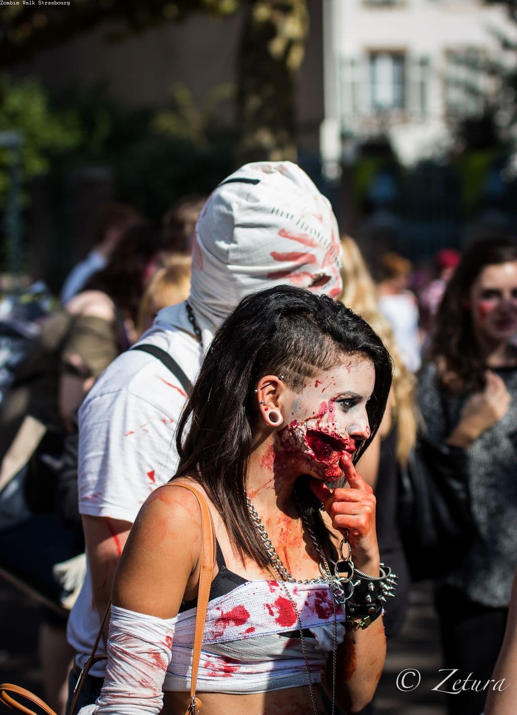 Plus de 3 500 personnes ont participé à la Zombie Walk (marche des zombies) ce samedi après-midi, un record pour cet évènement qui lance le Festival européen du film fantastique. Certains maquillage étaient particulièrement réussi, il faut préciser que pour cette année, les organisateurs s’étaient adjoints les services de spécialistes, qui ont commencé à zombifier les Strasbourgeois deux heures avant le défilé.