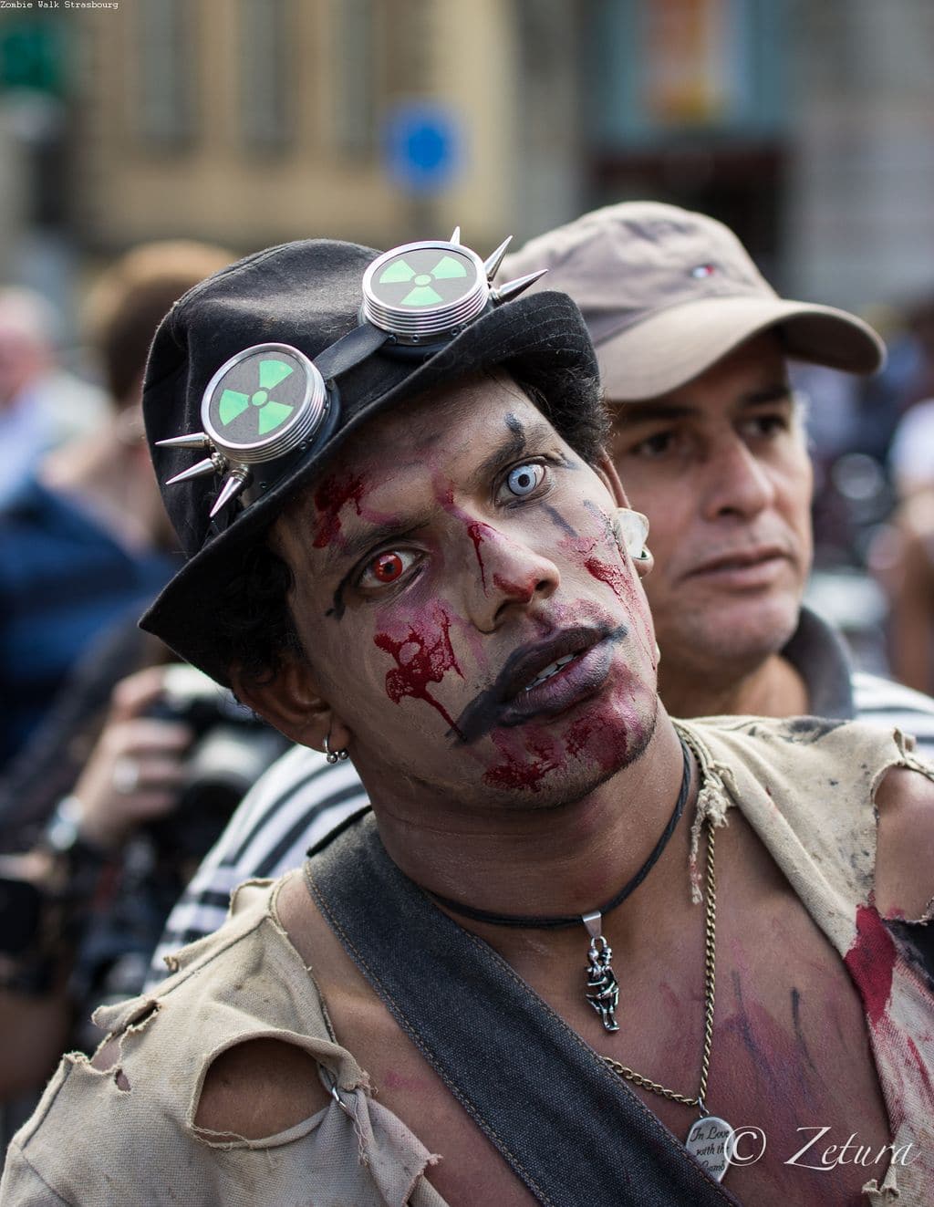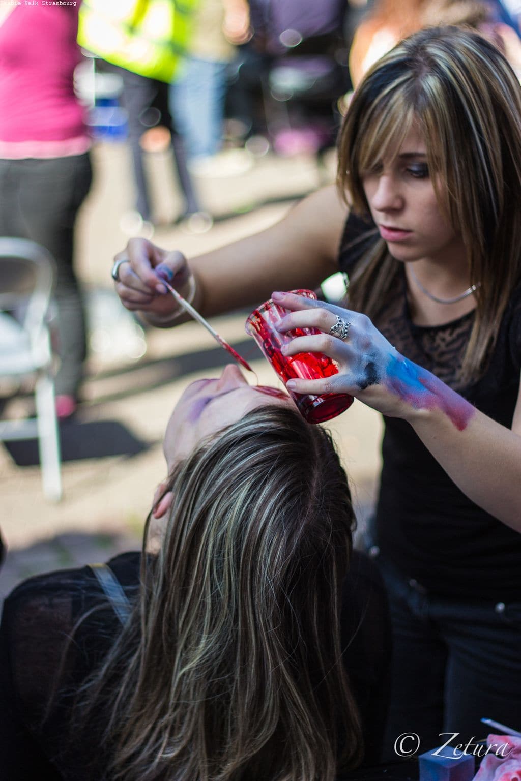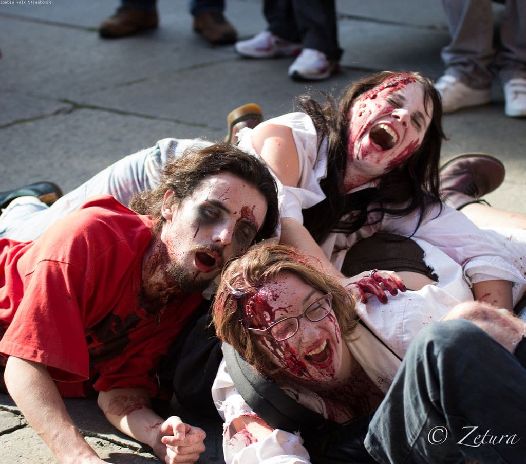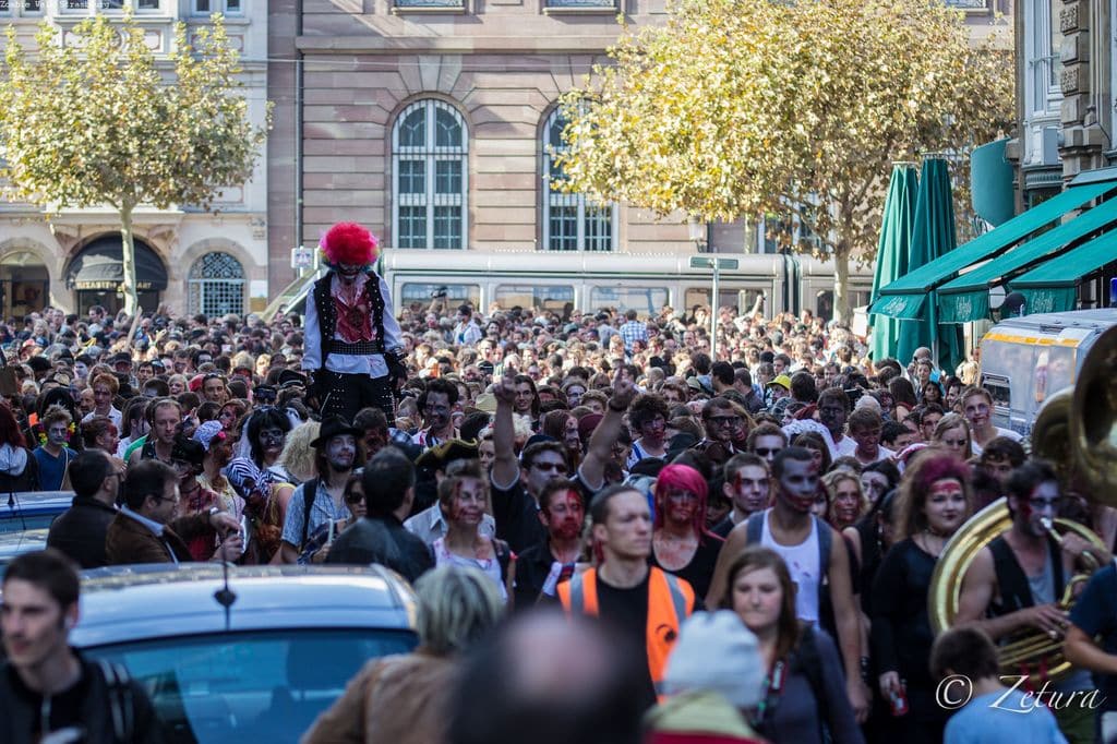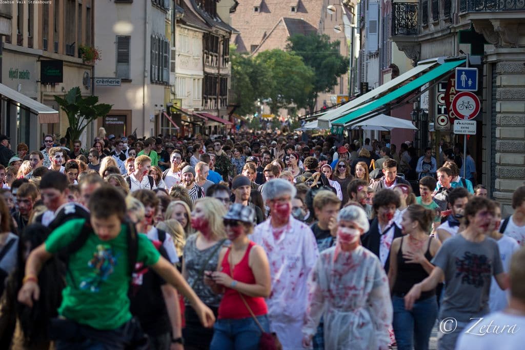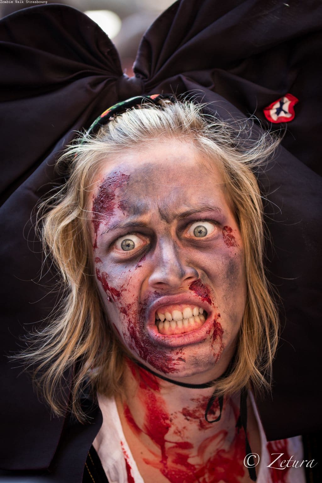 Plus de 3 500 personnes ont participé à la Zombie Walk (marche des zombies) ce samedi après-midi, un record pour cet évènement qui lance le Festival européen du film fantastique. Certains maquillage étaient particulièrement réussi, il faut préciser que pour cette année, les organisateurs s’étaient adjoints les services de spécialistes, qui ont commencé à zombifier les Strasbourgeois deux heures avant le défilé.