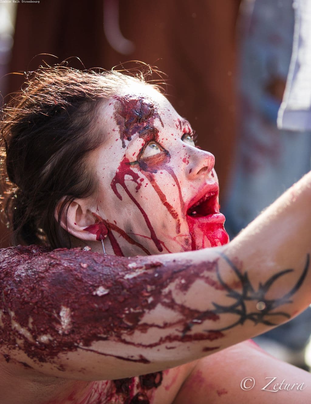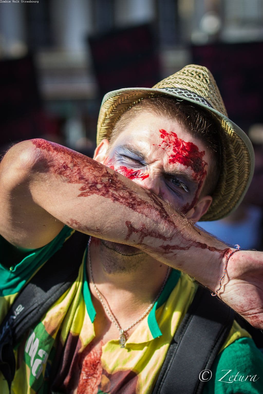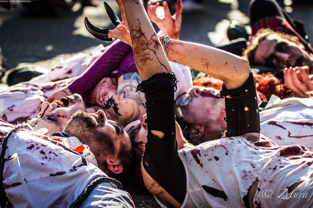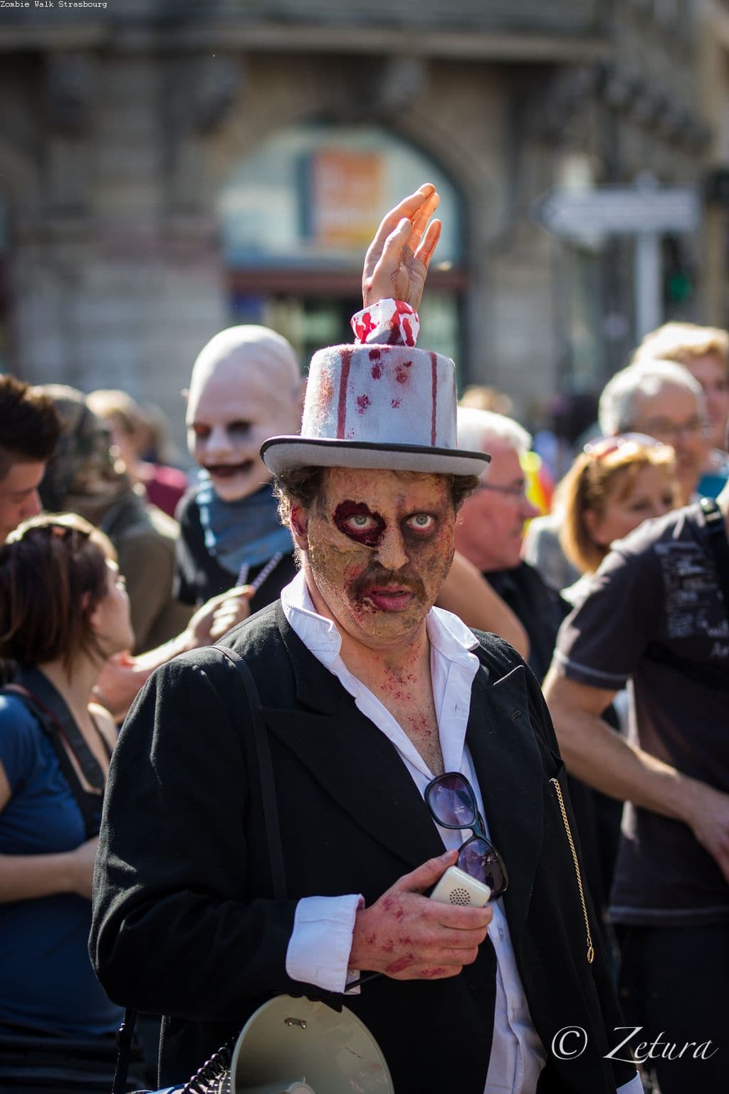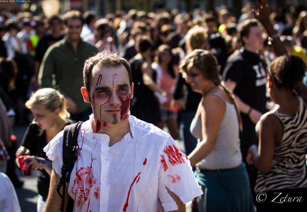 Plus de 3 500 personnes ont participé à la Zombie Walk (marche des zombies) ce samedi après-midi, un record pour cet évènement qui lance le Festival européen du film fantastique. Certains maquillage étaient particulièrement réussi, il faut préciser que pour cette année, les organisateurs s’étaient adjoints les services de spécialistes, qui ont commencé à zombifier les Strasbourgeois deux heures avant le défilé.