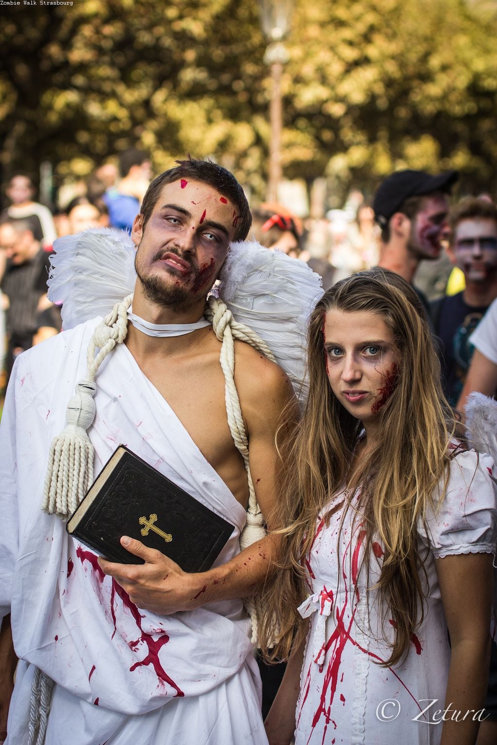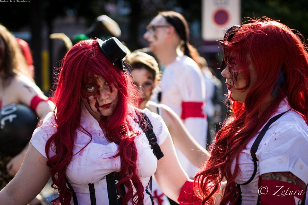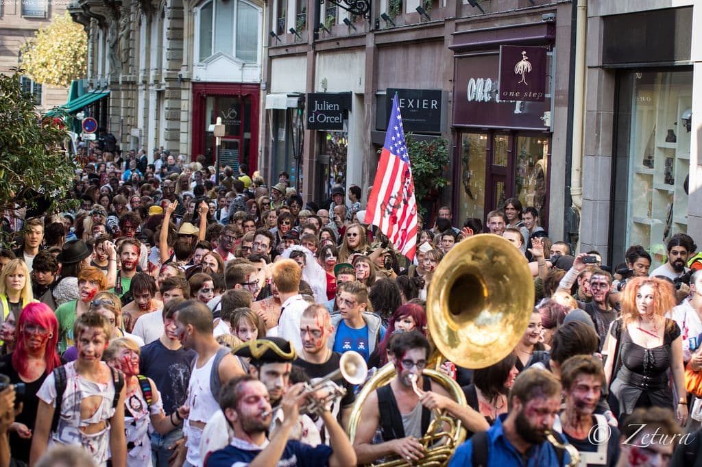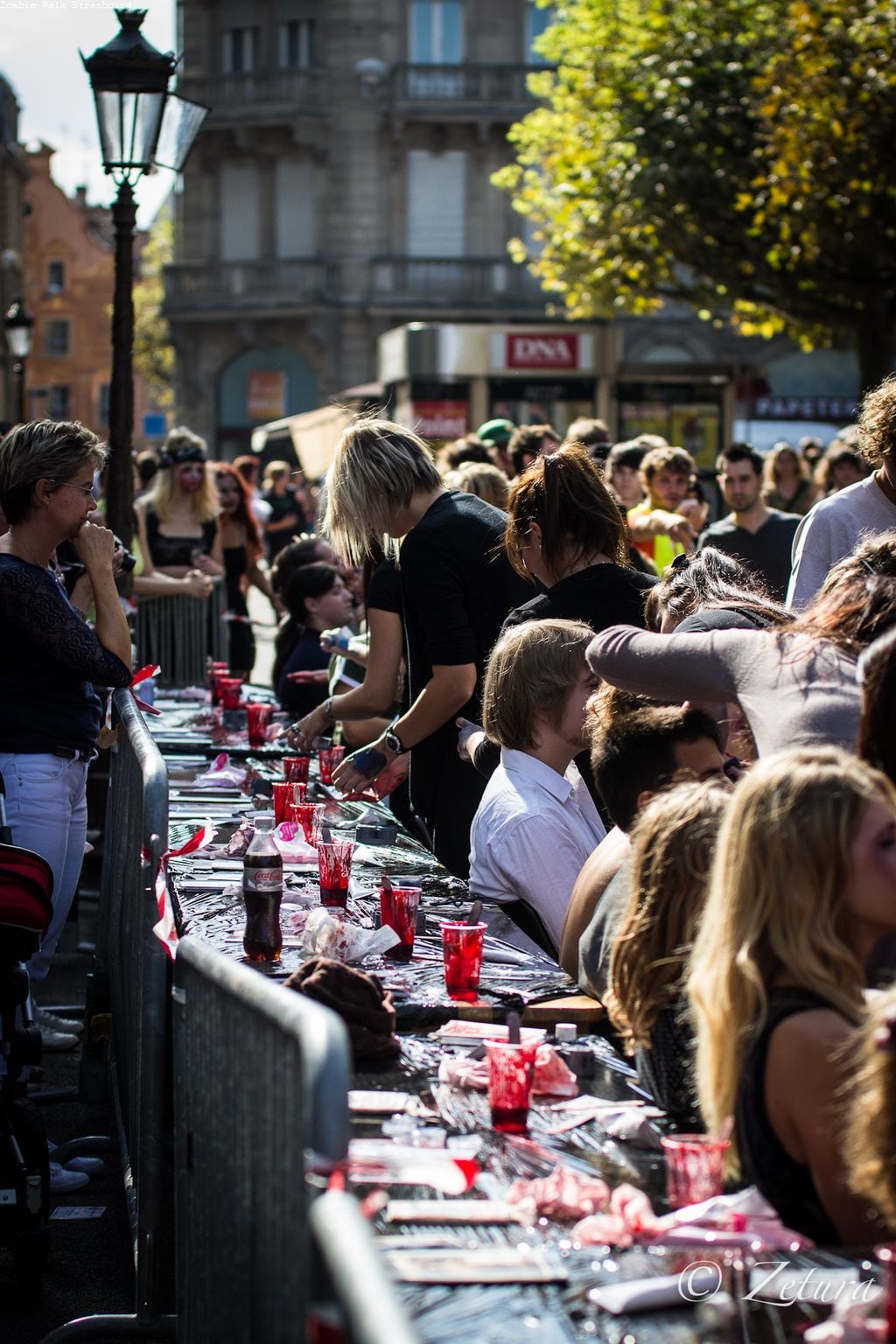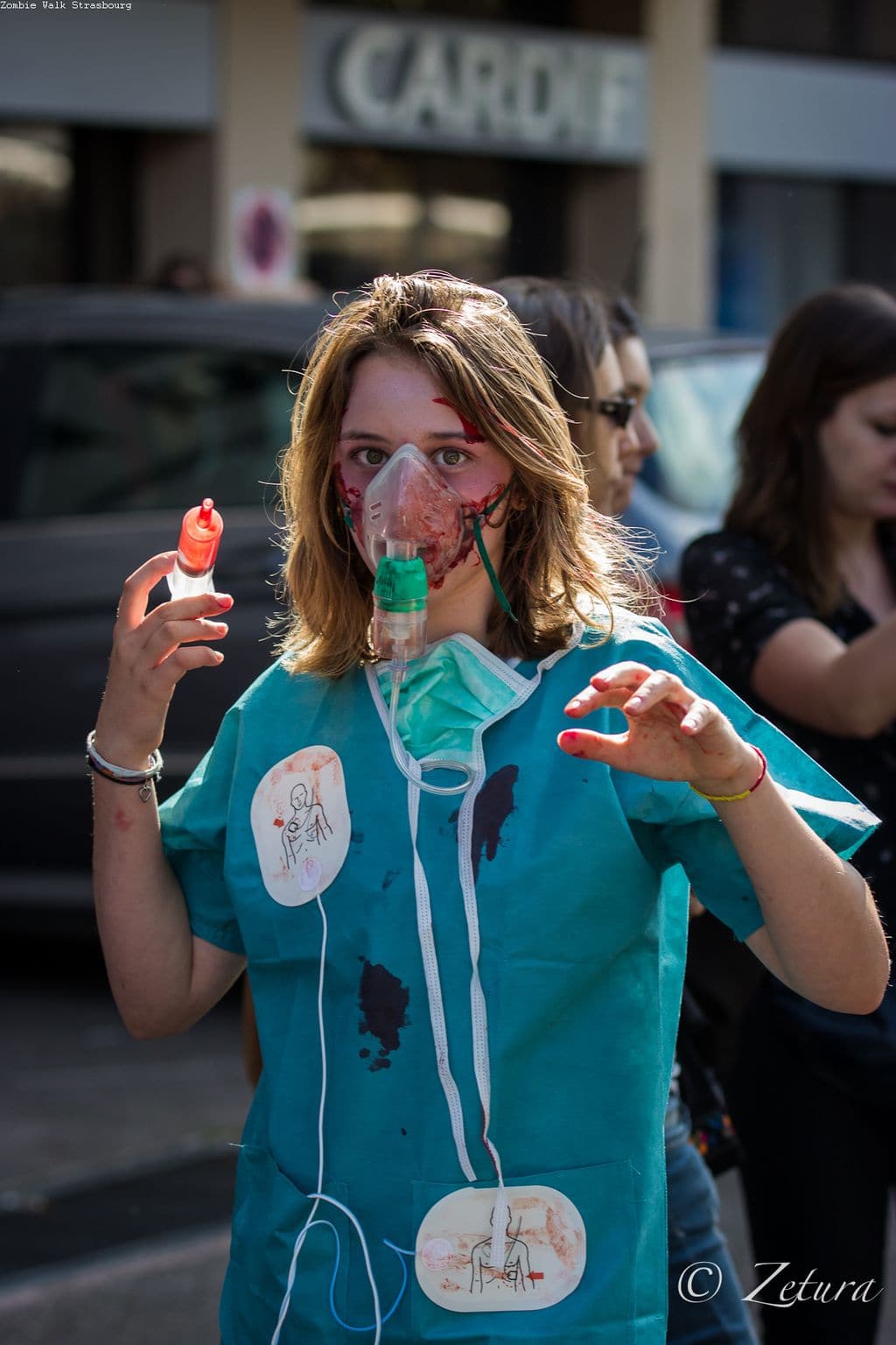 Plus de 3 500 personnes ont participé à la Zombie Walk (marche des zombies) ce samedi après-midi, un record pour cet évènement qui lance le Festival européen du film fantastique. Certains maquillage étaient particulièrement réussi, il faut préciser que pour cette année, les organisateurs s’étaient adjoints les services de spécialistes, qui ont commencé à zombifier les Strasbourgeois deux heures avant le défilé.