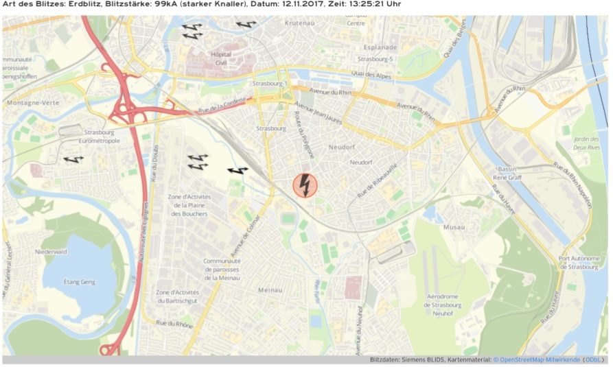 « Ce qui était remarquable c’était les éclairs. Une décharge très puissante et deux impacts de foudre simultanés. Nous mesurons la puissance de la foudre en kilo ampères. En général un éclair normal mesure entre 5 et 50 kilo-ampères (kA). Le premier impact hier a été mesuré à 149 kilo-ampères et le deuxième à 99. Bien au dessus de la moyenne donc. Environ 3 kilomètres séparaient les deux impacts. Le premier était à la sortie de la ville le long de la N4, à proximité du quartier de Hautepierre, et le second au niveau du stade de la Meinau au Neudorf. »