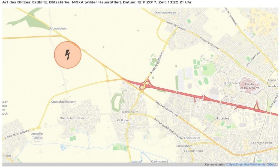 « Ce qui était remarquable c’était les éclairs. Une décharge très puissante et deux impacts de foudre simultanés. Nous mesurons la puissance de la foudre en kilo ampères. En général un éclair normal mesure entre 5 et 50 kilo-ampères (kA). Le premier impact hier a été mesuré à 149 kilo-ampères et le deuxième à 99. Bien au dessus de la moyenne donc. Environ 3 kilomètres séparaient les deux impacts. Le premier était à la sortie de la ville le long de la N4, à proximité du quartier de Hautepierre, et le second au niveau du stade de la Meinau au Neudorf. »
