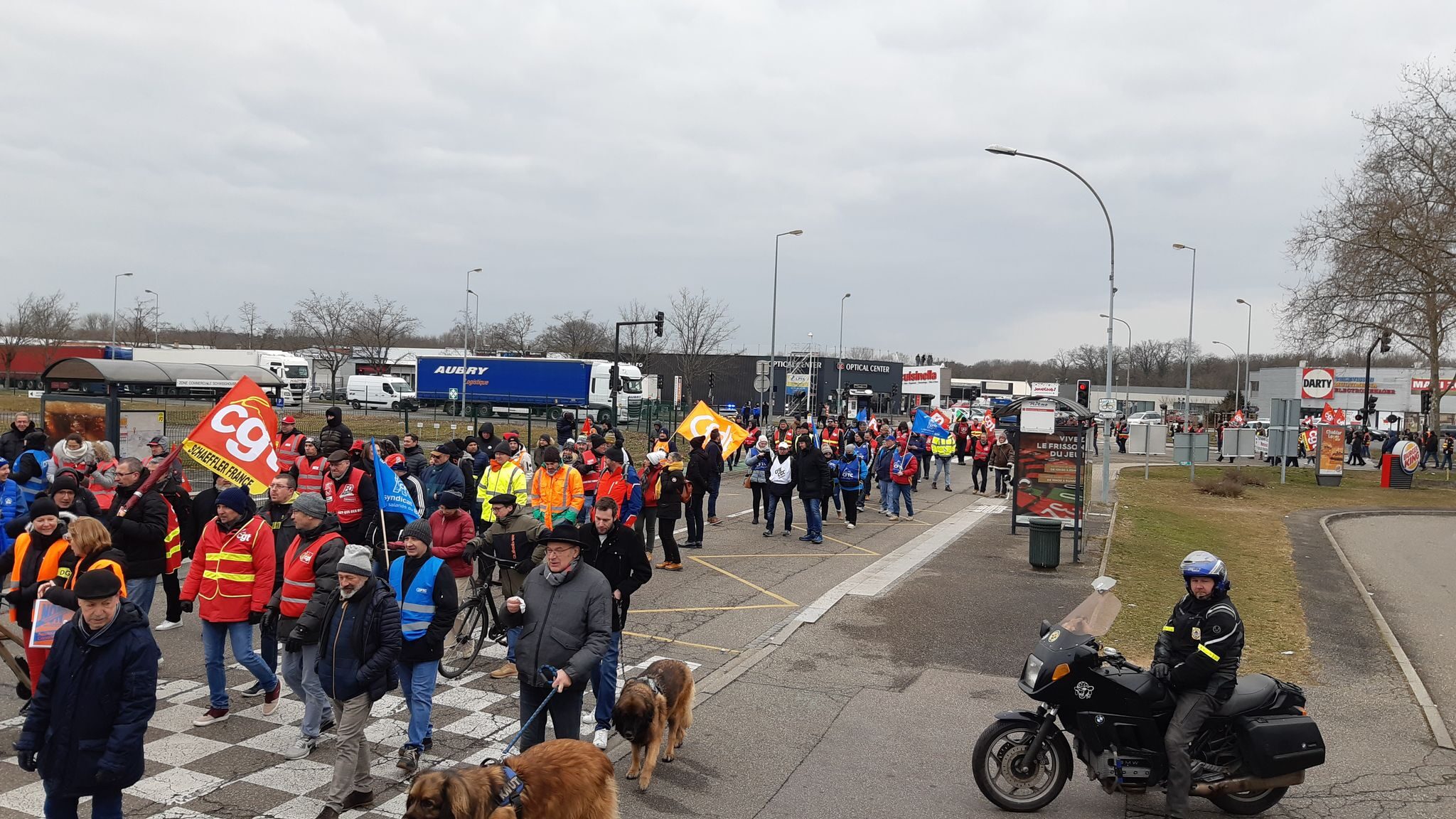 Selon Victor, délégué FO chez Alstom à Haguenau, plusieurs centaines de personnes défilent dans la zone artisanale. Elles ont répondu à un appel intersyndical des unions locales à se mobiliser au départ du rond-point devant l’usine Schaeffler. Le cortège installe des barrages filtrants aux ronds-points de la zone et prévoit de continuer ces actions jusqu’à la fin de la matinée en direction de Schweighouse-sur-Moder.