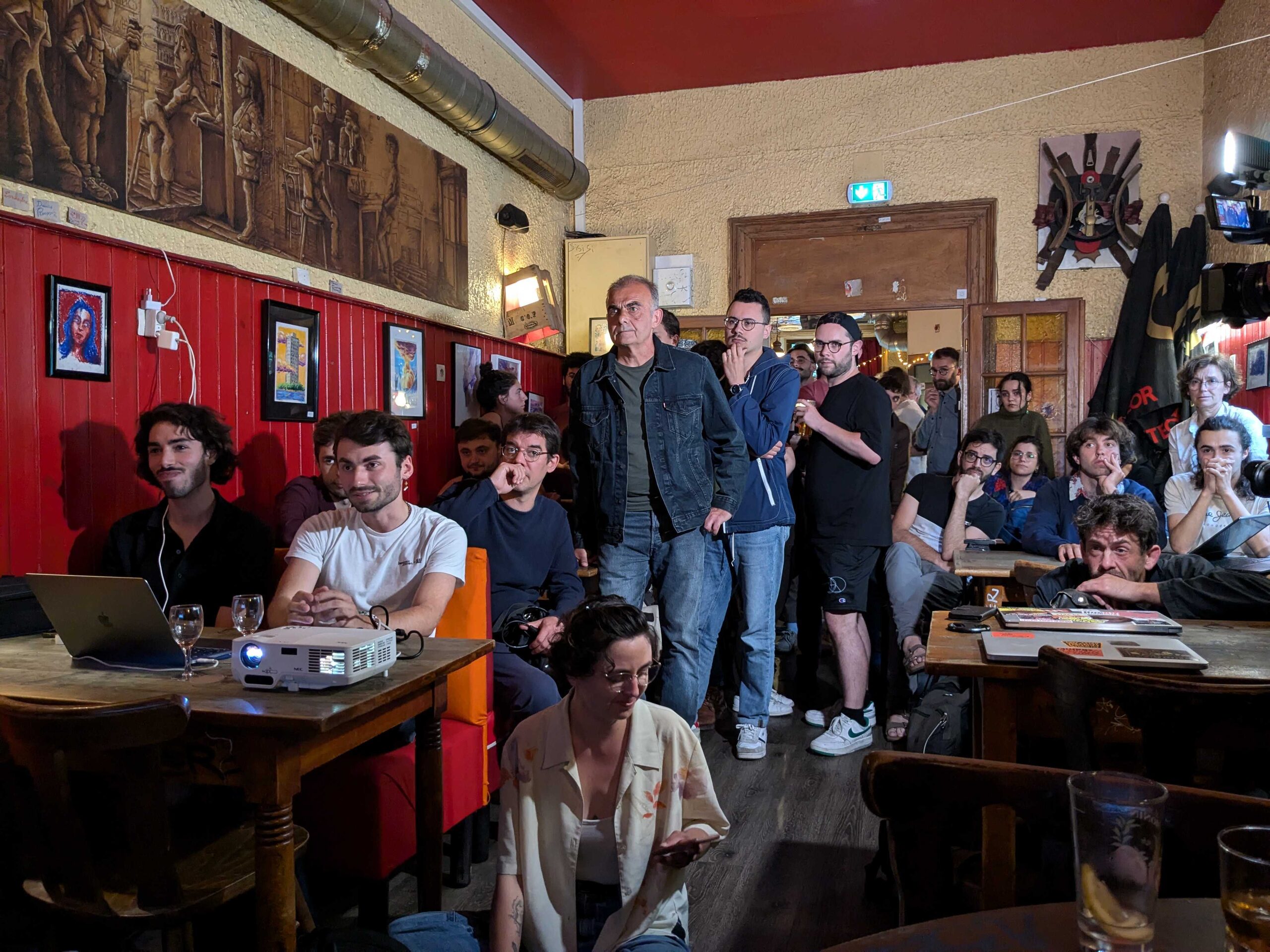 Devant les résultats, les visages des sympathisants du NFP restent fermés, abattus. « Bon, on savait que le RN serait en tête… » lance quelqu’un dans le public. À chaque table, chacun se lance dans les pronostics pour le second tour.