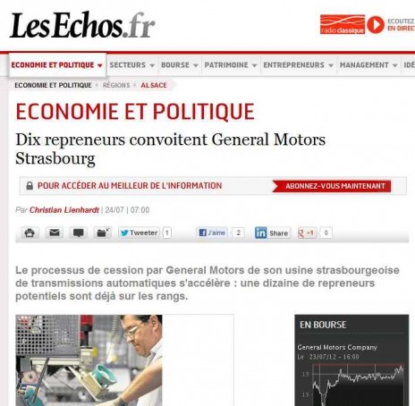 Depuis la nouvelle annonce de la mise en vente par General Motors de son usine de Strasbourg, les inquiétudes du millier de salariés grandissent car ils craignent de ne pas pouvoir être intégrés à une stratégie industrielle par un éventuel repreneur. L’usine de Strasbourg fabrique quasi-exclusivement des boites à six vitesses automatiques pour le marché automobile américain. Selon Les Echos, les salariés peuvent entrevoir une éclaircie dans leur ciel ombragé, car une dizaine de repreneurs se sont manifestés, un bon signe d’un intérêt industriel pour cette usine. En 2009, lorsque GM pour faire face à ses difficultés de trésorerie avait décidé une première fois de vendre l’usine, aucune offre sérieuse ne s’était présentée.