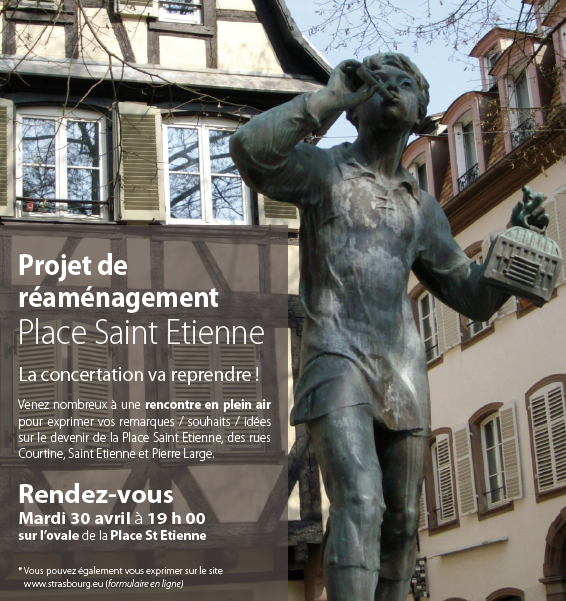 Ebauchée en 2012, la concertation des habitants en vue de réaménager la place Saint-Etienne, au centre-ville de Strasbourg, reprend mardi 30 avril. La place doit devenir une zone de rencontre dans la continuité du réaménagement récent de la rue des Frères. A cette occasion, un nouveau concept est expérimenté : le « carto-questionnaire » (PDF). Il sera diffusé par différents canaux : téléchargeable sur le site de la ville de Strasbourg, mis à disposition chez les commerçants du quartier Saint-Etienne ou diffusé dans les établissements publics et scolaires voisins (Foyer de l’étudiant catholique – FEC, collège Saint-Etienne, etc.).
